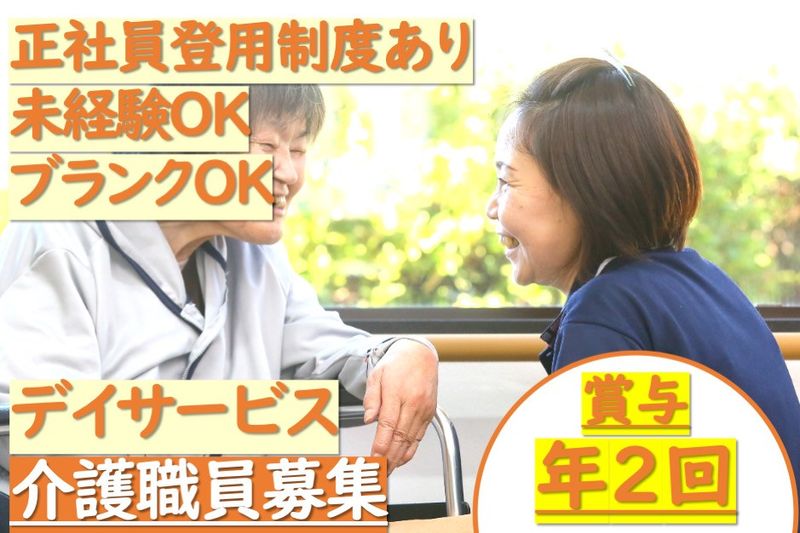 【アピールポイント】 デイサービスにて介護職員を募集します! ●賞与年2回あり! ●未経験の方も大歓迎! ●ブランクのある方も大歓迎! ●社員登用制度あり!