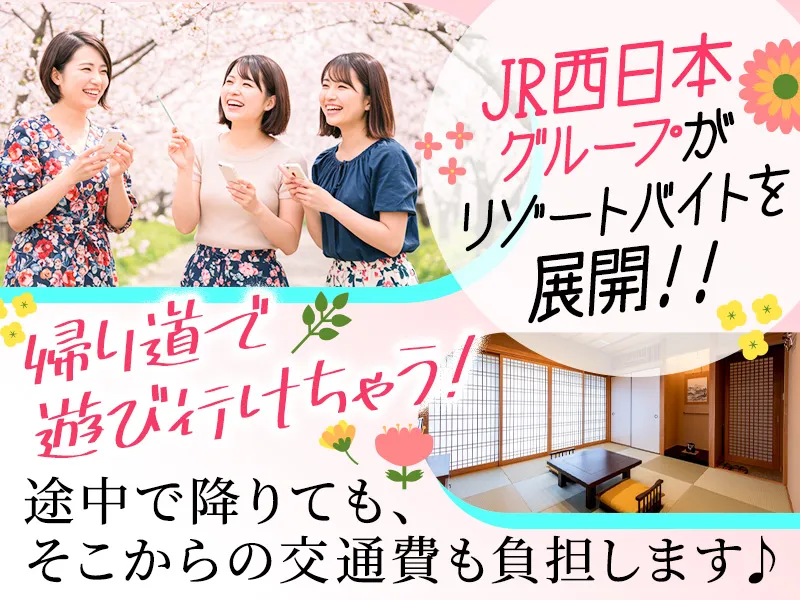 仕事内容 <この求人のポイント> *福井県・美浜町の海沿いにあるホテルレストランでリゾートバイト♪ *準備・配膳・片付け・清掃など、レストラン運営に幅広く関わるポジション* *動きのある仕事が好きな方にぴったり! *7/20 ~ 8/31までの短期バイト◎短期で始めて長期への切り替えもOKです☆ *個室寮完備で住込みOK *寮費無料 *まかないありで貯金もできる♪ *友達を誘ってのご応募OK 【仕事内容】 福井県三方郡美浜町 美浜温泉のホテルで 朝食・夕食のサービス業務を担当していただきます。 ▽具体的には… ・朝食・夕食の準備 ・配膳、下膳 ・片付け、洗い物 ・清掃 ・他部署へのヘルプ対応 ・状況に応じたレストラン業務全般 難しい専門スキルは必要なく、 明るく前向きにチームで働ける方であれば未経験の方でもスタートしやすい環境です。 【服装・持ち物】 黒のスラックス、Yシャツ長袖もしくは半袖、肌着、革靴もしくはパンプス ※サンダルが2つあると便利です!(寮用と仕事用) 【魅力的なエリア情報♪】 福井県・美浜町の海沿いにあるホテルでの勤務です! コンビニ・スーパーまで徒歩15分圏内と生活にも困らない環境で、リゾート感を味わいながら働けます。 ☆★☆アピールポイント☆★★ \JRグループの【日払いシステム】/ 日払い・週払い・月払いを希望に応じて! 『今週はピンチだから日払いに』など 自分の好きな時にお給与を受け取る事が 出来るから嬉しい! \さらに嬉しい!/ ご家族での利用も可能な『ジェイアールウエスト倶楽部』に加入できます! 映画を安く見れたり、レンタカーを半額でレンタルできたりなど 様々な特典が利用できます! 他にも育児や介護の補助制度、結婚お祝い制度など 長く快適に働ける環境を整えています! 【1P=1円に変換できるポイントをお給料とプラス支給◎】 就業後アンケート回答&4時間以上の就業で 1日300円分のWESTERポイント付与! 例えば、 20日稼働で6,000円分付与が実現! 貯まったポイントは交通系ICカードへ変換◎ 1P=1円の使用可能なので、 コンビニや、カフェ・飲食店などで利用OK◎ もちろん、鉄道での利用もOK! \18,300円分のポイント付与実績あり/ さらに!今ならリゾートバイト経験者採用制度で1日500円分のWESTERポイントを付与◎ ※もちろん未経験の方の応募も引き続き大歓迎です! ※以下の条件①~③をすべて満たす方が対象となります。 ①観光地やリゾート地の施設(ホテル、旅館、レジャー施設等)での就業経験がある方 ②60日以上の住み込みでの就業経験がある方 ③就業後(就業期間満了後)、アンケートに回答いただける方