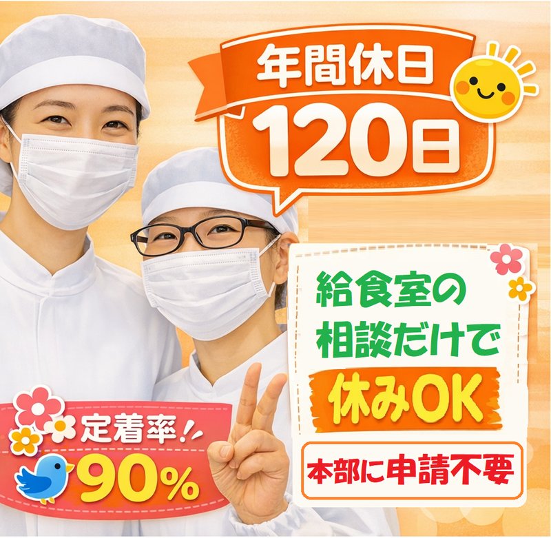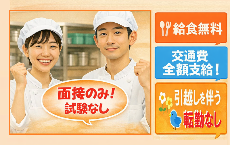仕事内容 ⭐ 月給25〜38万円×土日祝休み ⭐ 3年定着90%!創業60年の安定企業運営 杉並区本天沼の中学校の給食室 ✿新年度スタートにつき正社員、増員募集✿ 調理師資格があればOK。実務未経験歓迎! ⏩未経験でも月給25万円~、年収380万円 飲食店などからの転職者活躍中! ⏩調理師経験者は最大月給38万円の開始可 「流れ作業の調理に、物足りなさを感じていませんか?」 効率優先のセントラルキッチンや、深夜まで及ぶ飲食店勤務。 もし今の環境に疲れているなら、当社の「学校給食」という選択肢を考えてみませんか。 ・✦・✨ 学校給食室はココが◎✨・✦・ ✅ 完全、土日祝休み! ✅ 年間休日120日+有給休暇あり ✅ 15:30までで残業なし! ・✦✦・✨ 当社ならではの待遇 ✨・✦✦・ ✅ スタッフ同士の相談だけでお休みOK ✅ 春夏冬休みがあり、連休取れます! ✅ 給食無料/制服・マスクなど全て無料 ✅ 衛生上の待機でも給与6割保障 ✅ 引っ越しが必要な転勤なし ✅ 月1回、食品などが当たる抽選会あり 【仕事内容】 地元の旬の食材を活かした調理がメイン 中学校給食室での調理業務全般と食材管理の仕事です。 献立に従って毎日同じ食数を、みんなで一緒に調理するから、学校給食室が初めての方も安心ですよ。 ▼ 在職中の方もスムーズに転職できます ▼ ⏩面接1回のみ!筆記・実技なし ⏩応募は約1分でカンタン入力 ⏩電話応募も歓迎▶028-638-5655 <こんな会社です> 全国にスタッフ3000名在籍の安定企業。 創業60年以上の実績で、長く働ける環境。 ■■■■■【 当社の魅力 】■■■■■ ⭐長年の実績で 「調理師の専門性に見合った報酬」を追求し、業界内でも際立つ高水準の給与設定を実現! 「今の職場より収入も休みも良くしたい」 そんな方、ぜひご応募ください。 経験年数などで、開始月給から優遇! ⭐温かな社⾵で「3年定着率90%︕」 当社はフルーツやビール等が当たる「プレゼント抽選会(毎⽉)」の実施など 従業員を単なる労働⼒ではなく、 共に歩む「仲間」として⼤切にする⽂化が根付いています。