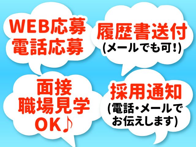 応募方法 興味をお持ちいただいた方は、 応募フォームよりお気軽にエントリーください。 【WEB応募/24時間受付】 エントリー確認後、追ってご連絡いたします。 お電話でのお問い合わせも可能です。 ※可能な限り早めのご連絡を心掛けておりますが、 ご連絡に2・3日程お時間をいただく場合があります。 ※エントリーいただいた全ての方にご連絡いたしますので、 ご連絡があるまでお待ちいただけると幸いに存じます。 【ご応募後について】 応募完了後、応募時に入力していただいたメールアドレス・電話番号(SMS)宛に、 応募企業とのメッセージのやり取りを開始するために通知をする可能性がございます。