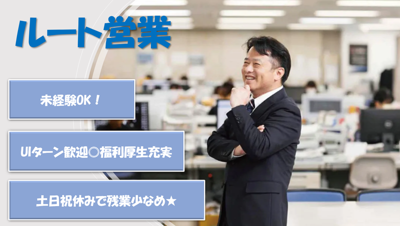 求めている人材 ◇高卒以上 ◇要普通自動車免許(AT限定可) ◇営業未経験歓迎! ◇営業経験者も大歓迎! ◇第二新卒歓迎 ◇社会人デビューも応援! ◇20代~30代が活躍中! ◇Uターン歓迎 ◇Iターン歓迎 ※人柄重視の採用です 【未経験スタートも活躍中!】 手厚い研修制度が整っているので、 異業種からの転職者も多数活躍中!! 「BtoBの営業に興味がある」 「有形商材の営業をやってみたい」 「スキルを磨いて成長したい」 「業界をリードする会社で働きたい」 など、志望動機は様々◎ 人と話すことが好きな方や コミュニケーションを取るのが得意な方は 未経験でも活躍できますよ♪
