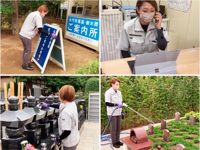 仕事内容 穏やかな環境で働きたい方におすすめ! お墓の知識は一切不要。未経験から始められる、 永代供養墓・樹木葬の受付案内・管理のお仕事です。 ◆20代・30代・40代・50代の男女スタッフ活躍中! 中高年スタッフも活躍中! 中高年から異業種にチャレンジしたい、そんな方の転職も応援します ◆人に寄り添い感謝される、やりがいあるお仕事! ◆研修制度やサポート体制充実◎未経験でも安心! 分からないことを気軽に質問でき、 意見も伝えやすい風通しの良い職場です。 【仕事内容】 ・永代供養墓・樹木葬の見学者の受付ご案内 ・お申込み手続き、PC入力、書類整理などの事務作業 ・墓域の清掃、見回り、墓誌の設置、納骨などの管理業務 【一日の仕事例】 08:30[開苑作業] 案内看板やのぼり旗の設置、案内所内の清掃 08:45[墓域清掃・水撒き] 落ち葉などの掃き掃除や除草、樹木葬の木々への水撒き 10:00[受付・ご案内] 見学者にお墓のご説明や納骨までの流れをご案内 ※主に事前予約をいただいたお客様のご案内になります。 11:00[納骨業務] 納骨場所の蓋を開け、お預かりした遺骨の納め作業 12:00[お昼休憩] 13:00[墓域見回り・清掃] 14:00[墓誌設置作業] 墓誌をお墓に固定(片手で持てる程度の重さ) ※墓誌とはお名前が彫刻された石板のことです。 15:00[受付・ご案内] 16:00[事務処理] 日報作成や申込み手続きなどの事務作業 17:00[閉苑作業] 案内看板等の片づけ、境内や墓域内に残っている人がいないか確認後閉門 17:30[業務終了] ※お寺の閉門時間が決まっていることもあり、残業はほとんどありません ▼業務の一日を動画でもご覧いただけます https://youtu.be/Vuu_j4Ba7w0 【研修について】 しっかりとしたマニュアルに加え、現地での研修もございます。 作業が進む中でわからないことがあると思いますが、 気軽に質問できる環境を整えています。 誰でも最初は初めてですので、ご安心ください。 【働くスタッフの声】 Aさん(40代/入社1年目/未経験) 「お客様から直接感謝の言葉をいただけることが、何よりのやりがいです。 スタッフの皆さんが丁寧にサポートしてくださるので、 未経験の私でも安心して仕事に取り組むことができています。 お寺の静かな環境の中、もくもくと作業に集中しながら働けています。」 Bさん(30代・入社3年目・接客経験有) 「これまでの接客経験を活かして働きたいと思い、入社しました。 仕事を通じてお墓や終活に関する知識を学ぶ機会があり、 覚えることは多いですが、新しいことに挑戦できる環境です。 会社の成長とともに、自分自身も成長していることを実感しています。」 【お問い合わせだけでも大歓迎】 少しでも気になったという方は、 応募フォームからお気軽にご応募ください!
