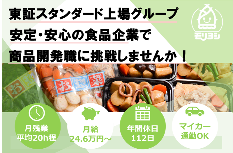 仕事内容 \「おいしさ」を届ける、商品開発の仕事です/ 東証スタンダード上場の「KOZOホールディングス株式会社(旧:小僧寿し)」のグループ企業としてスーパーマーケットを中心にお惣菜の提案をしている当社。一人暮らし・共働き世帯の増加に伴う中食市場の拡大の影響もあって、着実に事業成長を続けています。 スーパーマーケットに並ぶ、手作りのお惣菜。その“味・品質・見た目”をつくり出す商品開発チームの一員として活躍していただきます。 流行や季節感、地域のニーズを取り入れながら、日々の食卓を豊かにする商品をゼロから企画。 試作・改良を重ね、お客様の「また買いたい」を生むヒット商品を手がけていきましょう! ▼主な仕事内容 ・お惣菜の商品企画・アイデア出し ・市場調査(トレンドや競合商品のリサーチ) ・商品のレシピ設計(味、価格、ボリューム等を検討) ・試作品の調理・評価・改善 ・原材料の配合検討・表示ラベルの作成 ・製造現場へのレシピ伝達・工程共有 ・お取引先(スーパー等)との打ち合わせ・提案 など \現場研修でしっかりサポート/ 入社後はまず、当社惣菜の製造現場でのOJTからスタート。 どのような工程で商品がつくられているかを理解することで、開発業務にもスムーズに取り組めるようになります。現場を知っているからこそ、実現可能でおいしい商品がつくれる――それが私たちの強みです。 ◎この仕事の魅力 ✔ あなたのアイデアが形になり、全国の売り場に並びます ✔ トレンドを取り入れた開発で“食の楽しさ”に貢献 ✔ 製造チームや営業、クライアントとの連携で、幅広いスキルが身につく ✔ 地元・群馬で腰を据えてキャリアを築ける安定の本社勤務