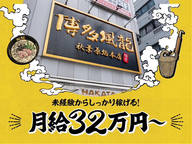 仕事内容 【POINT】 ✅飲食未経験でも月給32万円以上◎ ✅残業ほぼなし&大型連休あり♪ ✅頑張り次第でキャリアアップ可能! ✅20代~50代まで幅広い年代が活躍中! <<まずはお気軽にご連絡ください!>> 080-8705-6073(担当:赤池)まで ■――――――――――――――――――――――――――――― 働いているスタッフやリアルな職場を知りたい方はこちら!! ▶https://menya.ne.jp/ ”株式会社MENYA” で検索!! ――――――――――――――――――――――――――――――■ 【仕事内容】 都内中心に複数展開する『とんこつラーメン 博多風龍』の店舗スタッフとして、 接客・調理及び店長や副店長のサポートをお任せします。 ~具体的には~ *お客様のご案内・接客・提供 *ラーメンの仕込み、調理 ~店舗運営サポート~ *スタッフの教育・育成 *売上管理、シフト作成 *その他店舗運営全般 他 未経験から活躍できる理由♪ ╰━━━━━━━v━━━━━━━╯ 明るく元気な対応ができれば全くの未経験でも大丈夫です!いわゆる「見て覚えろ」なんてことはなく、 明確な指針のもと成長していける環境です。業務効率化にも注力しており、 券売機やカウンター中心の作りでお客様対応だけに追われない体制を整えています! 回■回■回■回■回■回■回■ ⚡『博多風龍』で働く魅力⚡ 回■回■回■回■回■回■回■ ⏩未経験でも高収入を実現! L飲食店未経験の方でも、月給32万4207円からのスタート! 昇給あり◎業績などでの給与ダウンはありません! ⏩年3回大型連休あり! L世間と同じ期間に休めるため、ご家族やご友人との予定も合わせやすいです。 もちろん通常時も有給休暇を使って連休取得ができます! ⏩意欲次第でキャリアアップ! L入社時(月給32万円~)→副店長(月給38万円~)→店長(月給42万円~)→マネージャー(月給47万円~)→統括(月給51万円~) と段階的なキャリアパスをご用意。 中には入社~3ヶ月で店長になったスタッフもいます!あなたの頑張りがそのまま評価に繋がる環境です。 ⏩髪型・髪色・ネイル・ピアス自由! Lあなたの個性を尊重します!髪型、髪色、ネイル、ピアス、全て自由! あなたらしいスタイルで、のびのびと仕事に取り組めます♪ 秋葉原、渋谷、新橋、上野、池袋、新宿、高田馬場、阿佐ヶ谷、大宮と都内近郊に10店舗を展開中! ※勤務地は希望に合わせて応相談 【スタッフインタビュー】2024年入社 Kさん 「博多風龍で働く前はアパレルや営業を経験しました。一人で働くことが多かったので、 『もっと大勢でワイワイ仕事がしたい!』と思って博多風龍に。お客様として来た時に、 お店の活気がすごくて『ここで働いたら楽しそう!』って思ったのがきっかけです! 博多風龍の働きやすいポイントはここ◎ ✅残業ほぼなし!仕事終わりの予定も立てやすい! ✅食券制&シンプルな作業で、未経験でもスグ慣れる! ✅頑張り次第でしっかり稼げる給与体系が魅力! 仕事のやりがいは、常連のお客様が顔を覚えてくれて『美味しかったよ』と声をかけてくれる時。 外国人のお客様と身振り手振りでコミュニケーションを取り、『ありがとう』と言ってもらえた時もすごく嬉しいですね。 ラーメン屋が初めての方でも本当に働きやすい環境です!ラーメン作りはシンプルで覚えやすいし、 食券制だから難しい注文取りもありません。 何より、やる気さえあれば誰でも歓迎してくれる雰囲気があります。 僕自身、一度辞めてまた戻ってきたくらいですから(笑)。 給料も良くて、基本的に定時で上がれるので、プライベートも充実させやすいですよ。 ぜひ一緒に、活気のあるお店で楽しく働きましょう!」