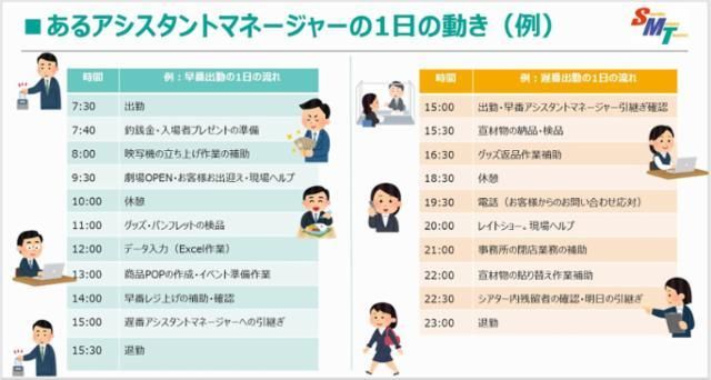 勤務曜日・時間 7:30~25:00(シフト制) ●終電後の退勤時に発生するタクシー代は、 劇場で負担いたします。 ≪シフト例≫ 早番)7:30~15:30 遅番)15:30~23:30 ※休憩45分、実働7.25時間 ※時期により勤務時間の変動あり ※週3~5日の勤務です