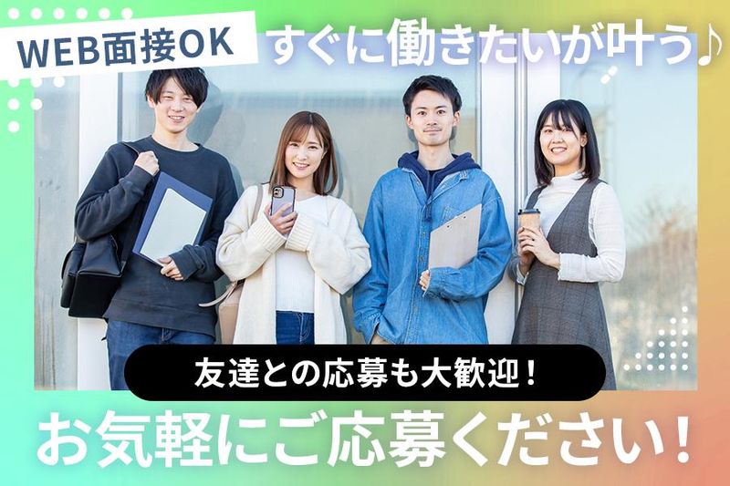 選考プロセス WEBまたはお電話にて受付♪ 応募後担当者よりご連絡いたします。 希望の面談日時を教えてください。 【入社までの流れ】 応募 ▼ 面接 オンラインで実施いたします。 面接前に履歴書の提出をお願いいたします。 ▼ 合否 ▼ 入社 ※入社日は相談の上決定