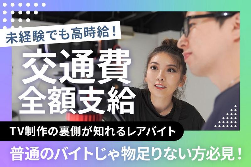 求めている人材 ◆未経験大歓迎 ◆経験者優遇 ◆ブランクOK ◆学歴不問 ◆男女歓迎 ◆学生活躍中 ◆友達と応募大歓迎 【こんな方にオススメ】 ・テレビ局でのお仕事に興味がある方 ・スキマ時間で働きたい ・学業と両立して働きたい ・将来就活に使えそうなバイトをしたい ・髪色自由のバイトがしたい ・テレビ局って面白そう ・将来テレビ局で活躍したい ・人とは違うお仕事をしてみたい方 どんな志望動機でもOK! まずはお気軽にご相談ください(^^♪