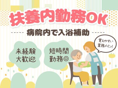 仕事内容 看護助手(入浴専門スタッフ) ★★簡単サクッとWEB面接(リモート)実施中★★ 看護助手業務の入浴介助をお願いします。 入浴専門スタッフがきちんと丁寧に教えてくださいます。 【業務内容】 ▼衣服の着脱介助・補助 ▼入浴時の介助・補助 ▼入浴後の浴室清掃 …など、患者様入浴時の準備ほか、 介助含むサポート業務全般 介護・福祉関係の資格は不要。 病院や施設での実務経験も不問! 新人さんは周囲がしっかり フォローするので、不安なく スタートできます♪ お気軽にご応募ください◎ <SA_N>