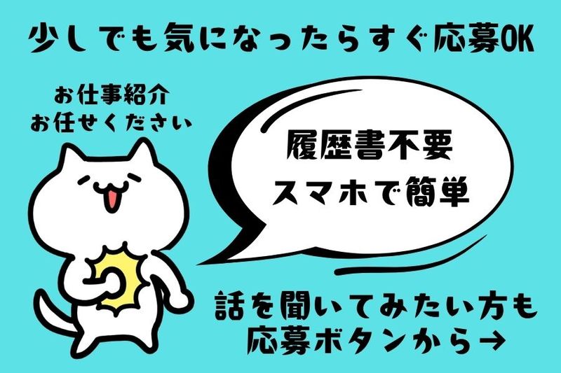 求める人材: 経験不問・未経験歓迎・ブランクOK 難しい作業なし!スキル・資格不要なので、 製造業デビューにおすすめのお仕事です! まずは気軽にご応募ください