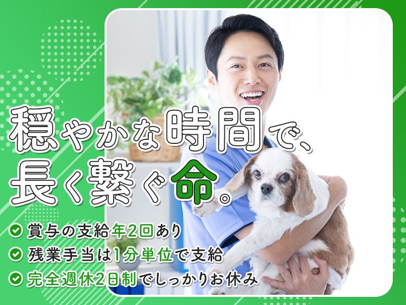アピールポイント \\穏やかな時間で、長くつなぐ命// 【ママさん獣医師も安心の環境】 過去にはママさん獣医師の在籍実績もあり、 現在も3名のスタッフのうち2名が主婦の方です。 「今日は授業参観だから中抜けしたい」 「子供が急に熱を出してしまった」 そんな時も、スタッフ同士で協力し合うのが当たり前の風土です。 院長がしっかり現場に出ているからこそ、 個別の事情にも柔軟に寄り添えます。 【自由度の高い中休み(12:00〜16:00)】 診察の合間の中休みがある場合は 一度帰宅して家事を済ませたり、 お買い物に行ったりと自由に過ごせます。 週40時間の勤務を守っていただければ、 日ごとの時間配分も相談可能です。 【地域貢献を実感】 地域に根差した診療で、 開院以来、長きにわたり 地域の獣医療に貢献してきました。 穏やかな飼い主様が中心で、 直接感謝の言葉をいただく機会も 多いので、やりがいを実感できる はずです〇 【プライベートも充実】 残業はほぼなしで、 完全週休2日制のため、 しっかりお休み可能です。 自分時間を大切にしたい方にも 最適な環境だと言えます〇 【自分らしく働く】 業務に支障のない範囲で おしゃれを楽しみながら 自分らしく働くことができます。