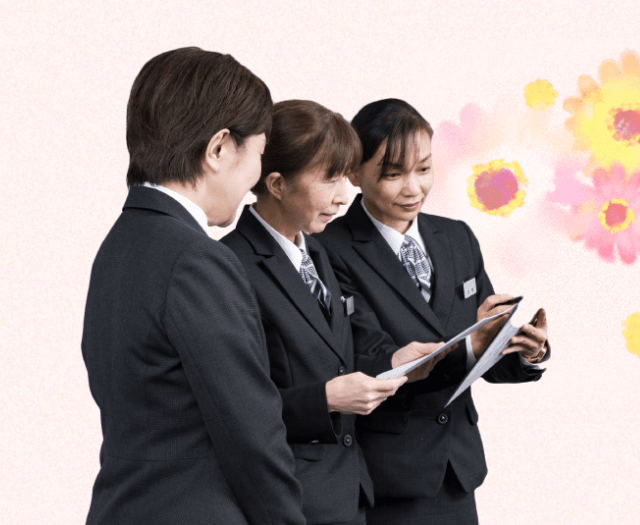 職場環境 現在活躍しているスタッフは12名(うち新人2名)。1日最高7件の葬儀・葬祭に対応しています。