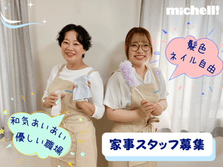 PR ミッシェル・ホームサービスの魅力 私たちは、創業19年の家事代行専門企業です。 「人を大事にすること」をモットーに、スタッフ一人ひとりが安心して働ける環境づくりに力を入れています。 スタッフ満足度◎口コミ評価4.7以上 90%が未経験スタート 座学・実技・現場研修など充実の研修制度 優しい社風&手厚いフォロー体制 女性比率100% 主婦・ママさんが中心の職場 担当制で曜日・時間が固定。生活リズムを崩さず働けます 働き方はあなた次第 「週1日・1日3時間からOK」だから、家庭との両立もラクラク。 基本的に平日だけの勤務。土日祝は家族と過ごしたい方にもぴったりです。 急なお子さんの体調不良などで当日欠勤になっても、代わってもらえる体制が整っているので安心。 また、欠勤ばかりでは収入面では困っちゃう。 そんな時には、埋めるために他の曜日に振り替えることも相談できますよ。 主婦さんが多いので、困った時にはお互い様。(誰かの代わりに働いた時は、代理手当があるので、良いことしながらお得な気分です(笑)) 〈定期的に面談も実施中〉 “こんなことに困っている。”“もう少し働きたいなあ。”“最近忙しくなってきたから、少しシフトを減らしたいかも。”こんなご相談も受付中◎ 気兼ねなく相談してくださいね <スタッフの声> ■佐藤さん(40代・入社10年目) 「子どもが3歳の時に始めて、2人目の育休で3年休んだ後に復帰。 他社では相談できずに困ったこともありましたが、ミッシェルは専属マネジャーにすぐ相談できるので安心。 ママ友にも紹介して、今ではみんなで助け合いながら働いています。」 ■荒河さん(入社4か月) 「未経験で不安でしたが、研修が丁寧で安心して始められました。 現場でもすぐ相談できる環境が整っていて、心強いです。」 ■大塚さん(入社4か月) 「小さな子どもがいても働きやすく、フォローも手厚い。 働く女性を全力で応援してくれる会社だと思います 」 【収入の目安】 週1回・3時間勤務(月4回)→ 約15,600円 週2回・3時間勤務(月8回)→ 約31,200円 週3回・3時間勤務(月12回)→ 約46,800円 ※時給1,300円~1,500円+交通費全額支給 ※研修期間(5日間)は時給1,180円 「家庭優先で、少しだけ働きたい」方にはぴったりの働き方です。 また慣れてきたら案件を増やしていくことも可能です。