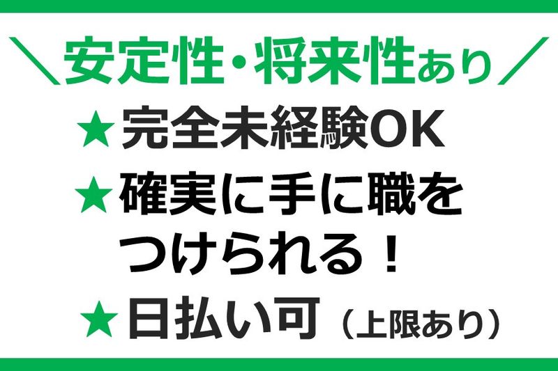 【応募資格】 ✨未経験積極採用中✨ 学歴・職歴・業界経験はすべて不問です! 「やってみたい!」という気持ちがあれば、まずは話を聞きに来てください! ■必須条件 ・普通自動車運転免許(AT可) ・資格取得の意欲がある方 【最終学歴】 学歴や、業種、職歴の経験は一切不問! 【メリット】 #急募 #主婦・主夫歓迎 #フリーター歓迎 #第二新卒歓迎 #未経験者歓迎 #新卒歓迎 #資格取得支援あり #40代も応募可 #昇給あり #賞与あり #即日払いOK #髪型・髪色自由 #ピアスOK #残業月平均20時間以内
