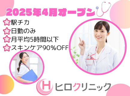 仕事内容 - *美容・医療に興味のある方、大歓迎! *業界未経験OK/ブランク明けでも安心 *スキンケア90%OFF! *当直・残業なしでプライベートも充実! - 【お仕事詳細】 看護業務全般 (美容施術を担当いただく場合もあり) *美容施術が未経験の方もご安心ください。 研修を行い、先輩がしっかりサポートしながら業務が可能です! 【診療科目】 ・NIPT(新型出生前診断) ・皮膚科 ・美容皮膚科、外科 ・形成外科 ★充実した福利厚生・スタッフ特典★ 働きながら「自分自身もキレイ・健康になれる」環境が整っています。 ・年12回、スキンケア施術を90%OFFで受けられる特別制度あり(社内規定あり) フォトフェイシャル/HIFU/脱毛など、最新設備が充実しています。 ・ボトックスや美容注射なども社員専用価格で受診可能 美容医療に興味がある方には嬉しい特典です。 ・ネイル・ピアスOK(社内規定あり) 自分らしさを大切にしながら働けます。 ・当クリニックでの診察・健康診断は無料 スタッフの健康管理もしっかりサポートしています。