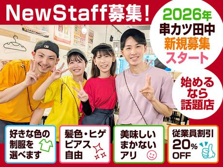 仕事内容 <未経験でも楽しく稼げるホール・キッチンのお仕事> ◆-◆ ★SNS・メディアで人気の[串カツ田中]が 2026年、大規模な採用をスタート! フリーター・学生・主婦(夫)みんな歓迎 ◆-◆ 【ホール】 ・ドリンクやお料理のオーダー取りやご提供 ・テイクアウトの対応 ・レジでのお会計 たこ焼きや出汁巻き玉子など、 お客様が自分で作るメニューでは 会話も弾んで楽しいですよ! 【キッチン】 マカロニサラダを盛り付けるだけ! トマトをスライスするだけ!の簡単な作業や 人気の串カツを揚げるなどの調理を任せます。