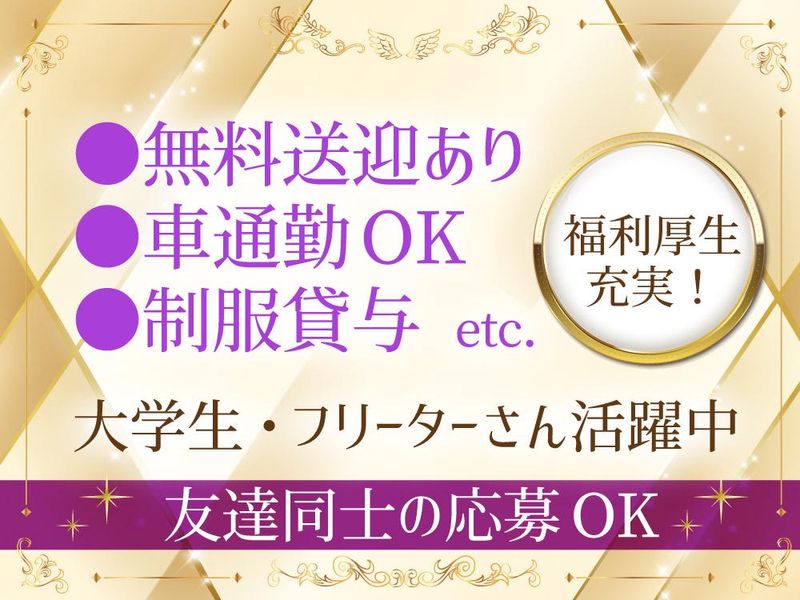 【保険制度】 雇用保険、労災保険、健康保険、厚生年金 待遇・福利厚生 【福利厚生】 ・日払いOK ・ノルマなし! ・WワークOK ・各種手当有 ・制服貸与(ドレス) ・車通勤OK(駐車場完備) ・寮完備(即入寮OK!) ・無料送迎あり(岡山・倉敷・福山) ・託児所補助あり