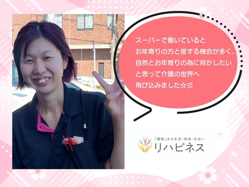 仕事内容 ☆☆☆☆☆☆☆☆☆☆☆☆☆☆☆☆☆☆ 電話番号:052-726-6301 WEB応募は24時間、365日受付中! ☆☆☆☆☆☆☆☆☆☆☆☆☆☆☆☆☆☆ 「あいじゅリハビリセンターDAIRIN」 は心の憩いの場! というのも・・・・ ◆利用者さんは優しい方が多く 元気をもらえます! ◆スタッフ同士協力的で、 子育て中の方にとっても働きやすい♪ 長期休みに子供を職場へ連れてくることも☆ 【弊社のポイント】 ☆確定拠出年金等による母子手当の 満額所持ができるよう相談可能! ☆お子さんや障害があるご家族の 対応もサポートします! ☆急なお休み(保護者会・病気等)でも きちんとお休み頂けます! ☆スタッフ全員で仕事を協力して取り組める 【仕事内容】 通所事業における、リハビリの補助・ 体操・送迎・軽介助・入浴介助をお任せします。 ※業務内容については柔軟に相談可能! <送迎について> 送迎エリア:施設から30分以内 車:普通車(AT車) ================ 【施設の特徴】 ☆2階建ての施設で定員は55名 1階は1日型、2階は半日型のデイサービス ☆平均要介護度は1.3 【スタッフについて】 合計:32名(男性:8人、女性24人) 年齢層:20代・30代・40代・50代・60代活躍中 ================ \以下より弊社のことをより理解して頂けます♪/ *Instagram* https://www.instagram.com/rehappinessclub?igsh=MXc2MXFnZjRseWJxcw%3D%3D&utm_source=qr *HP* https://rehappiness.com/ *tiktok* https://www.tiktok.com/@rehappinessclub?is_from_webapp=1&sender_device=pc[/qt]