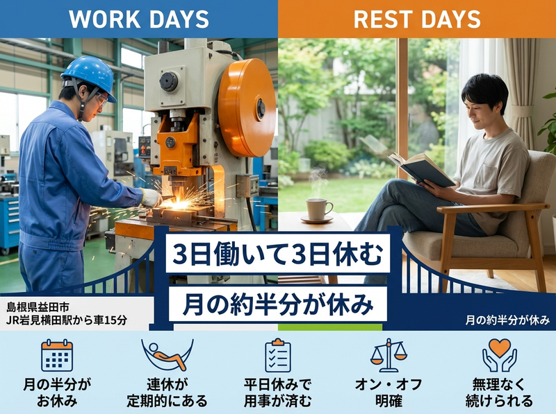 休日休暇 3勤3休のシフト制です⭐ ⏩ 3日働いたら、必ず3日連続でお休み ⏩ 月の約半分が休みになる働き方です✨ 平日休みが多いため、 役所・病院・買い物などの用事も済ませやすく、 自分の時間をしっかり確保できます✅ ⏩ 年間休日120日以上 体を休めながら、無理なく続けられる休日体制です⭐