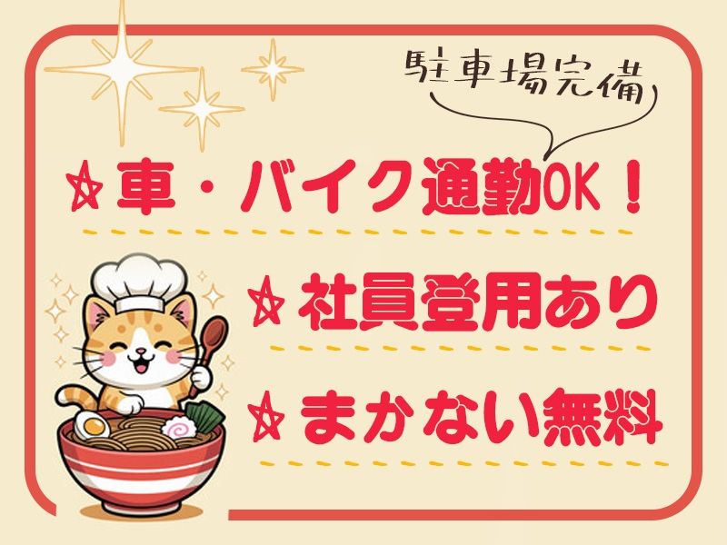 経験・資格 経験・年齢・学歴は一切問いません! 初めてのラーメン店勤務でも大丈夫。 調理も接客もゼロから学べる環境◎ 「ラーメンってどうやって作るの?」 「お客様に喜ばれる接客って?」 そんな方でも、働きながら自然と身に つきます。 ★こんな方にピッタリ★ ・自宅の近くで気軽に働きたい ・新しいお店で働きたい ・ラーメンが好きで作ってみたい ※深夜22時以降の勤務は 18歳以上(法令による)