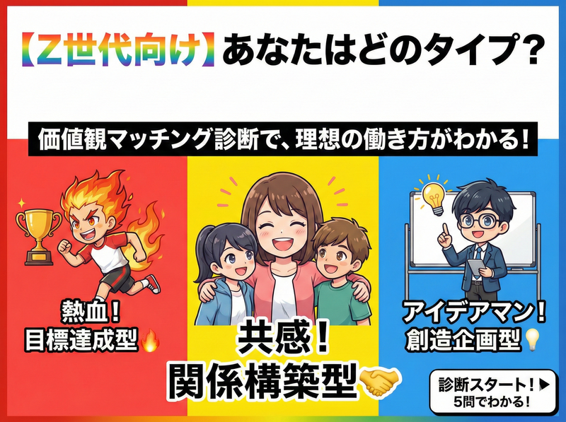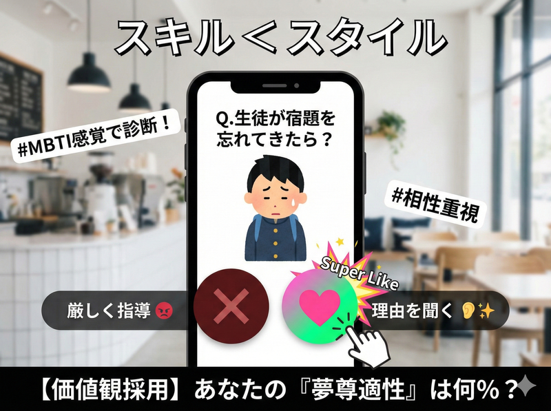 仕事内容 Z世代向け価値観マッチング診断: あなたの「夢尊スタイル」 適性度チェック はじめに: なぜ「スタイルマッチング」が 重要なのか 現代のZ世代は、 MBTI診断のように 自身の価値観やタイプを 当たり前に表現し、 それを通じて コミュニケーションを取る世代です。 従来の採用では 「カルチャーマッチ」が 重視されてきましたが、 表層的なカルチャーだけでは、 本当にその企業で働く人の 「スタイル (価値観や行動様式)」が マッチしているかを 見極めるのは困難です。 株式会社夢尊が求めているのは、 完璧な経歴や 高いスキルではありません。 生徒一人ひとりと向き合い、 共に成長していける「スタイル」を 持つ人材です。 あなたはどのタイプ?働き方診断 目標達成型(杉山さんタイプ) 「受験合格という明確なゴールに 向かって、生徒と二人三脚で 頑張りたい」 → 校舎長候補 関係構築型(田中さんタイプ) 「生徒との信頼関係を大切に、 長期的な成長をサポートしたい」 → 専任講師候補 創造企画型(佐藤さんタイプ) 「新しい指導法や校舎運営の アイデアを実験的に試してみたい」 → エリアマネージャー候補 スタイルマッチング診断 以下の質問に直感で答えてください。 AとBどちらに近いかを 選んでください。 Q1:生徒が宿題をしてこない時、 あなたはどう対応しますか? A. 規則を徹底し、 次回は必ずやってくるよう 厳しく指導する B. まず理由を聞き、 生徒の状況を理解した上で 一緒に解決策を考える Q2:保護者から 「成績が上がらない」と クレームを受けた時は? A. 塾の指導方針と学習計画を説明し、 システムについて理解してもらう B. まず保護者の気持ちに共感し、 お子様の状況を一緒に見直す 提案をする Q3:理想の教育とは? A. 全員を志望校に合格させること。 結果を出すのが教育者の責任 B. その子なりの成長を支えること。 人間として成長する過程を 大切にする Q4:授業中に生徒が 集中できない時は? A. 授業進行を優先し、 注意して静かにさせる B. なぜ集中できないか原因を探り、 授業内容を調整する Q5:チームで意見が分かれた時は? A. データに基づいて 効率的な解決策を提示する B. メンバーの意見を じっくり聞いて、 全体で合意形成を図る 診断結果 Bを多く選んだあなたは 「夢尊スタイル」です! あなたは生徒一人ひとりと向き合い、 対話を重視する夢尊の教育理念と 高い親和性があります。 完璧な指導者である 必要はありません。 生徒と共に悩み、 共に成長していく姿勢こそが 夢尊スタイルの本質です。 夢尊のリアル「B面」情報 田中校舎長(26歳)のとある一日 14:00 開校準備 コーヒー飲みながら 今日の作戦を立てます。 昨日の小テスト結果をチェックして、 つまずいてる生徒がいたら 個別フォローの準備。 15:30 小学生指導 「算数が苦手な佳奈ちゃん。 今日は図を使って説明してみよう。 分かった時の笑顔が見たい」 17:30 振り返りタイム 「今日の授業どうだった?」 「あの説明、 もう少し工夫できそう」って 先輩後輩関係なく 率直に意見を言い合える。 この時間が明日をより良くする 原動力。 18:00 保護者面談 「お母さん、実は太郎くんは 友達思いなんです」 成績だけじゃない成長を伝えると、 保護者の表情が パッと明るくなる。 この瞬間が製造業時代では 味わえない達成感。 22:00 退勤 残業は月10時間以内。 申請制で、 22時には必ず帰れます。 「先生の働き方が 生徒の手本になる」 という代表の言葉通り、 無理な残業はさせません。 夢尊スタイルの特徴を深掘り 1. 対話重視のコミュニケーション 夢尊では「なぜ?」から始まる 対話を大切にしています。 生徒が宿題をしてこない理由、 成績が上がらない背景、 やる気が出ない原因。 表面的な問題解決ではなく、 根本的な要因を 生徒と一緒に探ります。 実際の現場での声: 「最初は『面倒くさい先生だな』 と思われることもあります。 でも、生徒が 『先生は自分のことを 本当に理解してくれている』 と感じてくれた瞬間、 関係性が一気に深まります」 (入社3年目・校舎長) 2. 共感ファーストのアプローチ 保護者対応でも生徒指導でも、 まずは相手の立場に立って 考えます。 クレームは問題提起ではなく、 信頼関係を深めるチャンスと 捉えています。 3. 成長プロセス重視の教育観 夢尊では 「今日できなかったことが 明日できるようになる」 小さな成長を何より大切にします。 偏差値や点数だけでなく、 学習に取り組む姿勢や 自分で考える力の向上を 評価します。 夢尊で働く人たちのリアルな声 入社2年目・田中校舎長 (26歳)の場合 「最初は 『生徒に嫌われたらどうしよう』 『保護者に怒られたらどうしよう』 という不安ばかりでした。 でも、先輩から 『完璧である必要はない。 一緒に成長していけばいい』 と言われて気持ちが楽になりました。 今では生徒から 『先生のおかげで 勉強が楽しくなった』と 言ってもらえることも。 成績アップはもちろん嬉しいですが、 生徒の表情が明るくなったり、 自分か