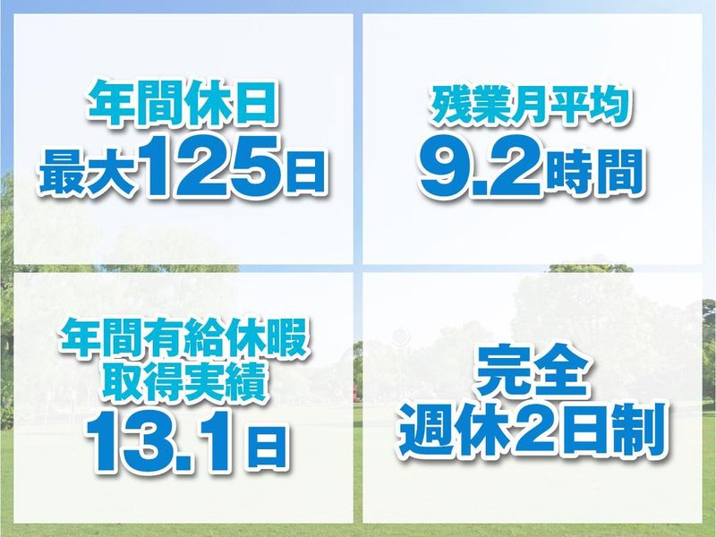 勤務時間詳細 実働時間:1日あたり8時間 平均勤務日数:1ヶ月あたり20日 9:00~18:00(休憩時間12:00~13:00) *配属先により異なる 所定労働時間を超える労働の有無:有 *月平均残業9.2時間(残業代100%支給) <プライベートも大切にできる!> 終業後は「ゲームをする」「動画を観る」「家族・友人・ペットと時間を過ごす」「資格取得の勉強」など自分の時間を満喫!