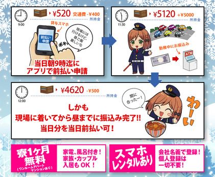 仕事内容 こんな方にピッタリ!! ・「週5はきついけど週1日なら...」と思っている方 ・掛け持ちバイト先(副業、Wワーク)を探している方 ・短期間でのお仕事をお探しの方 ・日払い/前払い制度が充実している会社で働きたい方 ・友人同士の応募OK ・若手、中高年、シニア活躍中 ・主婦・主夫活躍中 ・ハローワークでお仕事探し中の方歓迎 ・棚卸しやピッキング、梱包、イベントスタッフ経験者活躍中 ・工事現場、資材搬入・荷揚げ、移転・仕分け経験者活躍中 ・製造やフォークリフト業務などの工場内作業経験者活躍中 ・倉庫内軽作業、ドライバー、運搬、引っ越しなどの物流経験者活躍中 ・土木作業や現場作業など建築業務経験者活躍中 新生活を応援します! 【特 典】入社祝い金10万円支給!※規定あり 【雇用形態】アルバイト 【日 給】 11,000円以上可 (日払い可) 【研 修】研修中食事付き(研修中も日払可) 【対 象】短期・副業・WワークOK(年齢不問) 【勤務時間】08:00~17:00(休憩60分) 【 シフト 】シフト自由(週1、週2、週3OK) 制度も充実で働きやすい! ・スマホレンタル制度(月々3,500円)※規定あり └20GB,補償付き,端末代と電話かけ放題込み ・バイク通勤可/貸与制度 ・日払いOK(規定有) ・交通費全額支給 ・制服貸与(預り金なし) ・がん先進医療支援金制度あり(規定有) └がん発覚で見舞金10万円、最大500万円まで補償 入社後に丁寧な教育サポートがあるから未経験でも安心です。 ・週1日~勤務OK!短期での就業も可! ・急な出費にも対応可!最短当日振込の日払い制度あり! ・バイクやスマホレンタル制度あり! ・面接時履歴書不要、即日就業可能! 電話での応募も可能です! 「0120-95-4095」まで! 対応者まで『採用ページを見た』とお伝え下さい! 応募はもちろん「気になる」方も質問だけでも是非! 交通誘導警備員のやりがい『ありがとう』 事故やトラブルを未然に防ぐ抑止力となり、 さまざまな方の安全な暮らしを支えています。 ふとした瞬間の「ありがとう」が日々の励みになります!