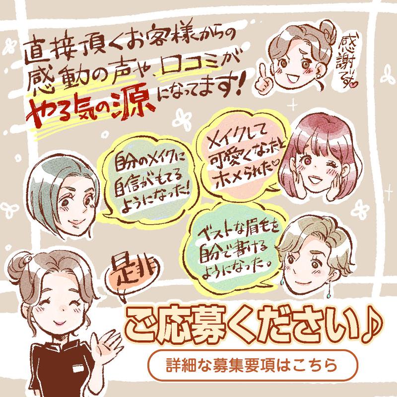 仕事内容: *メイクアドバイスに専念したい *数値にとらわれたくない *お客様に合わせて幅広く提案したい こんなあなたの『思い』を叶える環境で働きませんか? ≪MAMEWについて≫ 2007年に誕生したMAMEW。 プロスポーツ選手のコーチが、選手の個性を引き出しながら成長の手助けを行い、目標に向かって伴走するように、MAMEWではメイクの専門家として一人一人の「美しくなりたい」という願いをサポートしています。 例えばパーソナルカラー診断や独自に構築したメイク理論「骨筋メイク®」を通し、お客様に向き合い、魅力を最大限に引き出すメイクを一緒に見つけていきたいと考えています。 骨筋メイク®メソッドとは 人の顔の骨と筋肉の付き方から独自に構築したメイク理論「骨筋メイク®」をベースに、最適なメイク方法を導き出すメソッドです。 **POINT** ◆入社後は美容の基礎からメイクアップ法まできちんと研修 ◆売上ノルマはなく、お客様しっかりと向き合える ◆残業なく、お休みも取りやすい環境 ◆産育休の取得実績も豊富で長期キャリアも安心 ◆ネイル・髪色自由(制服あり) ≪業務内容≫ 「MAMEW」でのメイクレッスンの提供や自社化粧品の提案などをお任せします。 具体的には… ◎メイクレッスンの提供 パーソナルカラー診断+メイクレッスンで、90分のサービス。 メニューの組み合わせによって、時間は変動します。レッスンはすべてマンツーマンで、1日に担当するのは平日・土日ともに3~4人です。 なお、指名を受ければメイクレッスンのコース等で、同じお客様を複数回担当することもあります。 ◎自社化粧品・美容商品の提案および販売 店頭に並んでいる化粧品や美容商品で、メイクレッスンで使用した商品などをお勧めします。押し売りは一切なく、お客様から「これいいですね!」と声をかけていただくことも多いです。なお、販売に成功した際は販売インセンティブの支給もあります。 ≪入社後は≫ まずは本社にてサービスや当社のメイク、骨筋診断やパーソナルカラーについて座学にて学んでいただきます。その後は現場にて先輩社員と一緒に接客を行います。経験にもよりますが、3か月ほどで1人で接客ができるようになります。