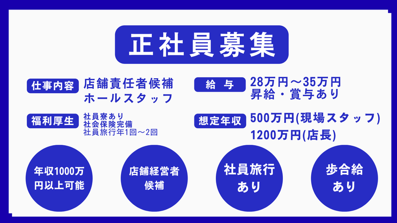 仕事内容 【奈良から全国へ。20代で“稼ぐ力”も“経営力”も手に入れる。】 接客だけで終わらない。店舗経営まで学べる仕事、しませんか? 【この仕事の魅力】 私たちは、奈良県から全国へ出店を目指し、 お客様にも、働く仲間にも「人に選ばれる店づくり」を本気で追求している会社です。 この仕事は、ただの店舗スタッフではありません。 ホール業務や接客だけでなく、人を動かす力、チームをまとめる力、お客様に選ばれる店をつくる力を身につけ、将来的には店長や幹部として店舗経営に関わることができます。 そして私たちは、そんな成長を“人を大切にする環境の中で実現できる会社”でありたいと考えています。 【当社で働く3つの理由】 ① 未経験からでも、段階的に成長できる教育体制 未経験の方には、入社当日に座学研修を実施し、その後は先輩社員と一緒にオープン準備、ホール業務、キッチン業務、閉店作業などを実践形式で学んでいただきます。 数日後にはホール・キッチン業務からウエイターとして独り立ちを目指し、その後も先輩からのフィードバックやアドバイスを受けながら成長できます。 さらに、備品管理、担当管理、シフト管理、お客様管理、店舗管理へとステップアップし、物・人・お客様・店舗の順で管理職への道を学べる環境があります。 ② 若いうちから高収入・昇格を目指せる環境 当社は年功序列ではありません。 勤続年数や年齢に関係なく、努力や成果を正当に評価し、給与やポジションに反映します。 実際に、店舗役職者の平均年齢は26歳。 最短で1年半で店長になった実績もあり、20代で店舗経営に携わることも可能です。 「定期昇給を待つ働き方」ではなく、 自分の頑張りで収入も役職も上げていきたい方にとって、大きなチャンスがある職場です。 ③ 人間関係を大切にしながら、人生の可能性を広げられる 当社が大切にしているのは、数字だけではなく人間性です。 年代の近い社員が多く、コミュニケーションが取りやすいため、馴染みやすく活気のある職場です。 また、この仕事では経営者、芸能関係、医療関係など、普段20代ではなかなか関わることのない方々と接する機会もあります。 働きながらコミュニケーション力を磨き、人脈を広げ、店舗経営も学べる。 今後の人生に大きく活きる経験ができることが、この仕事の大きな魅力です。 【募集職種】 店舗運営スタッフ・幹部候補(正社員) 【仕事内容】 ・オープン準備、ホール業務、キッチン業務、閉店作業 ・接客対応、店内オペレーション業務 ・備品管理、担当管理、シフト管理 ・スタッフ管理、キャスト管理 ・顧客管理、店舗管理 ・将来的には副店長、店長、幹部候補として店舗経営に関わる業務全般 【こんな方を歓迎します】 ✅ 人と関わる仕事が好きな方 ✅ 単純作業ではなく、コミュニケーション力を活かしたい方 ✅ 年功序列ではなく、実力で収入や役職を上げたい方 ✅ 20代・30代のうちに人脈や経験を広げたい方 ✅ 将来的に店長・幹部・経営者を目指したい方 ✅ 自分の可能性を広げたい方 ✅ 人が何をすれば喜んでくれるかを考えられる方 【当社の働き方】 入社初日から座学+現場実践の研修あり 未経験でも先輩社員のサポートを受けながら段階的に成長可能 若手が活躍できる評価制度 最短1年半で店長昇格実績あり 努力と成果を正当に評価し、給与にしっかり還元 人間関係を大切にした、活気あるチーム環境 将来的には店長・幹部として店舗経営を学べるキャリアパスあり 【待遇・条件】 ・給与形態(基本給や手当、歩合の詳細) 正社員 免許無し 月給28万円start〜35万円+インセンティブ 免許有り 月給30万円start〜35万円+インセンティブ ※免許有りには免許手当て2万円を含みます 〇インセンティブ制度 担当キャスト出勤時にインセンティブが発生します。 売り上げ50万円以下1出勤1000円×担当数 例:担当5人、出勤合計80日=8万円 基本給30万+8万円=38万円 売り上げ50万円以上の担当キャストの出勤日数×1500円×担当数 例:担当8人、出勤合計150日=22万5000円 モデル月給:基本給35万+22万5000円 →57万5000円 試用期間1ヶ月〜3ヶ月 ※試用期間のみ弁当手当て支給 労働日数×500円 店長給与 35万円+歩合給 平均60万円〜70万円 歩合給与20万円〜100万円 ※店長クラスは純利益の一部が達成報酬 【各役職】 社員 主任 チーフマネージャー マネージャー 副店長 店長 幹部職 ※主任以上から純利益の1〜10%の歩合給 【職場環境・待遇】 社員寮あり(家賃1万円のみで入居可)※規定あり 試用期間中は弁当手当あり※規定あり 社会保険完備 出産祝い金・結婚祝い金・誕生日祝いあり 家族手当あり 社員旅行年1回〜2回 学歴・資格重視ではなく人物重視の採用 スーツ一式支給※応相談 【キャリアステップ】 入社後は、 ホール業務・キッチン業務 → フロント業務 → キャッシャー・リスト業務 → 付け回し と段階的に各ポジションを学びます。 その後、 備品管理(主任) → 担当管理(チーフマネージャー) → 黒服管理(マ