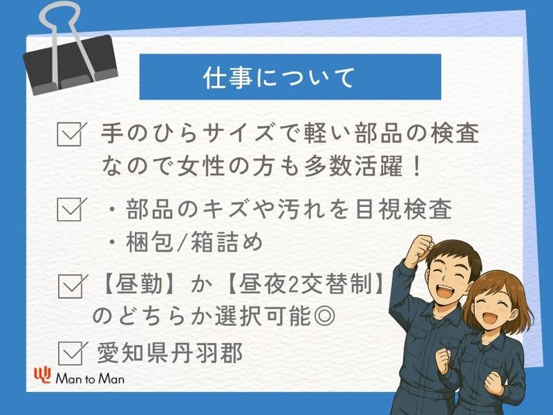仕事内容: 【職種】 小型軽量部品の検査や梱包 【仕事内容】 男女ともに活躍中のシンプル作業✨ 自動車エアコン部品の検査&梱包作業  ̄ ̄ ̄ ̄ ̄ ̄ ̄ ̄ ̄ ̄ ̄ ̄ ̄ ̄ ̄ ̄ ̄ キズや汚れが無いか目視検査をし その後、梱包、箱詰めを行います(^^)/ シンプルな作業になるので 未経験の方でも作業しやすくなっています✨ / 勤務時間えらべます('ω')❤ \ 昼勤のみor昼夜二交替 ご自身のライフスタイルに合った方で 勤務ができるのでおススメ✨ 最寄駅から徒歩5分と通勤も楽々♬ 食堂もあり昼勤の時はもちろん 夜勤の時でもご利用いただけます! 気になった方はぜひご応募ください! たくさんのご応募お待ちしております(^^)/❤