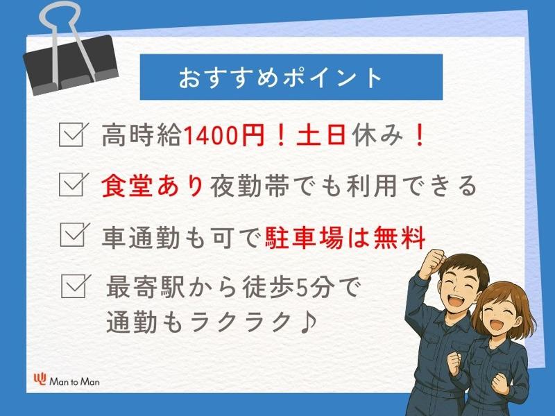 勤務時間・曜日: 【勤務時間】 【昼勤専属】 ・8:00-17:00(休憩 12:00-13:00) 【昼夜二交替制】 ・8:00-17:00 ・21:00-6:00(休憩 1:00-2:00) 【昼勤専属】or【昼夜2交替制】 ※ご希望をお聞かせください 【期間】 3ヵ月以上~長期 長期勤務できる方OK 派遣社員から直接雇用(正社員・契約社員等)の 実績多数あり! Man to Manでは毎年平均10~20名の方が 派遣社員から派遣先の直接雇用に 切り替わっています。 中途採用で入社することが難しい大手企業でも 派遣社員として業務に励んでいただくことで、 正社員や契約社員などになれる チャンスもあります!