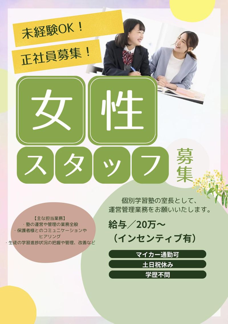 仕事内容 \タブレット学習の見守り!難しいお仕事なし✨/ 子どもの成長を見守りながら塾運営の経験もつめる☆彡 ===⭐ アピールポイント ⭐=== ✅未経験OK!資格・経験不問 ✅13時出勤で午前中は自分時間を満喫できます! ✅授業や採点は一切なし!生徒のサポートに専念✨ ✅完全週休二日制でプライベートも充実! ✅脱毛無料や塾代無料など独自の福利厚生が多数! ✅未経験から安心の1ヶ月間の丁寧な研修制度あり! ================== 【業務内容】 個別学習塾「松陰塾」にて、生徒一人ひとりの成長を支える教室運営のお仕事です。 最新のタブレット学習を導入しているため、 講義や採点といった教える業務は一切ありません。 未経験の方でも、子どもたちの見守りや教室環境の整備からスタートできる環境です。 ▼ 具体的なお仕事 ▼ ・生徒一人ひとりの学習進捗の把握とフォロー ・保護者様への連絡や面談、相談対応 ・アルバイトスタッフのシフト調整や管理 ・教室内の清掃や整理整頓などの空間づくり ・季節ごとの講習準備や入塾希望者への案 <入社後の流れ> 入社後はまず教室運営の基礎を習得していただきます。 数年後には、複数の教室を統括するマネジャー候補としての活躍や、 多角展開する他事業の運営に携わるチャンスもあります。 対人スキルやマネジメント能力を磨きながら、 将来的には会社の中心メンバーとして、 組織の拡大や部下育成を担うポジションを目指すことが可能です。 ▼経験ゼロでもこれで安心▼ 〇最初の約1ヶ月間はオンライン教材で 教育システムをじっくり学べる期間を設けています。 〇先輩社員がマンツーマンで、 生徒への接し方や塾運営のコツを一つずつ丁寧に伝授します。 〇システム化されたタブレット学習を導入しているため、 特別な学力や教える技術は不要です。 ▼当社で働く魅力▼ 〇運営は1人! 基本、1人での業務となる予定です。 ご自身のペースでお仕事を進めていただけます^^ 〇授業なし! タブレット学習塾のため、授業や採点はありません。 子どもたちが解けない問題があったときにフォローと手助けをお願いします! 〇福利厚生が充実! ご自身のお子さんの通塾やサロン利用など、プレゼンツの系列店が利用可能です♬ 自分にも家族にもうれしいポイントです☆ ▼株式会社プレゼンツについて▼ 「ありがとうが溢れる社会を創造する」ため、様々な分野での活動にチャレンジし続けている会社です♬ 教育事業部では、未来ある子どもたちに「自ら学ぶ」「自ら行動する」を身に着けてもらい、人生を豊かにするお手伝いをしています。 他には… ◆リユース事業 ◆EC事業部 ◆不動産事業部 ◆サロン事業部 なども展開中☆ ぜひ、 一緒に子どもたちの、また私たち自身の笑顔を創造していきましょう!