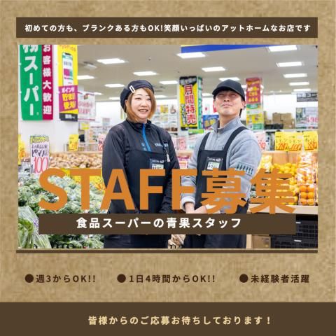 募集要項 職種 食品スーパーの青果スタッフ 雇用形態 パート 仕事内容 野菜・果物の袋詰め、品出し、加工、品質チェックなど 【具体的には】 その日の売れ行きに合わせて野菜や果物の袋詰めやパック詰め、 その他品出しや接客を行なっていただきます。 <白菜半玉なら値段は半分?> 「日本一楽しいスーパー」を目指す当社では 野菜を半分に切ったら値段も半分!初めてご来店いただいたお客様は 驚かれますが私たちの作業がお客様の喜びに直結するので どんどん切ってしまいます。 自分では買って食べた事がないような変わり種商品の仕入れも あるので毎日新鮮な気持ちで働いていただけます。 今いるスタッフも初めは短期や単発でのアルバイトを探していたけど、 長期的に働いてくれているほど毎日新鮮な気持ちで働ける環境です。 未経験から始めた先輩がたくさんいて一緒にサポートしますので未経験の方も ご安心ください。
