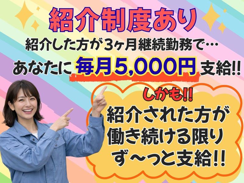 【保険制度】 雇用保険、労災保険、健康保険、厚生年金 待遇・福利厚生 【福利厚生】 ・社会保険完備 ・有給休暇 ・交通費規定支給 ・制服貸与 ・紹介制度あり(月5000円/規定) ============= 紹介した方が働き続けるほど あなたに毎月5000円✨ ============= 当社では、働く仲間を増やしてくれた方にしっかりお応えする「紹介制度」をご用意しています。 ・お知り合い・ご友人を当社にご紹介 ・その方が【3ヶ月継続して勤務】すると…⇒ 紹介者である”あなた”に【毎月5000円】を支給! ・しかも、紹介された方が仕事を続けている限り、【ずっと毎月5000円】がもらえます♪ 「一緒に働けてうれしい」 「そのうえ毎月うれしいプチ収入も」 身近な人と職場を良くしながら、自分のお財布にもプラスになる制度です。