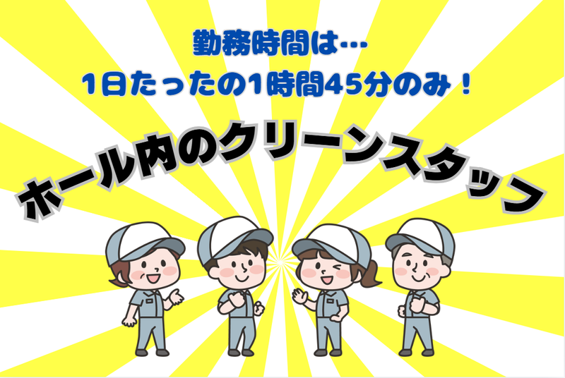 仕事内容 午前中1時間45分だけ! 未経験でもスグにできる 短時間のかんたん清掃作業。 都城市郡元町にある遊技場の 開店前の清掃をお願いします。 【主な仕事内容】 ・床のモップや掃除機掛け ・遊技台の拭き上げ ・床・トイレなどの清掃 パチンコ屋さんと聞くと、 「うるさい…」「たばこのにおいが…」 などのイメージがありますよね…(・.・;) でも、開店前なので静かな環境で働けます! 更に!ホール内でたばこは吸えないので、たばこのにおいが 充満…、なんてことはございません! ☆手分けをしながらテキパキ・モクモク頑張ってます♪ お仕事開始日もお気軽にご相談ください☆ 一緒に頑張りましょう♪