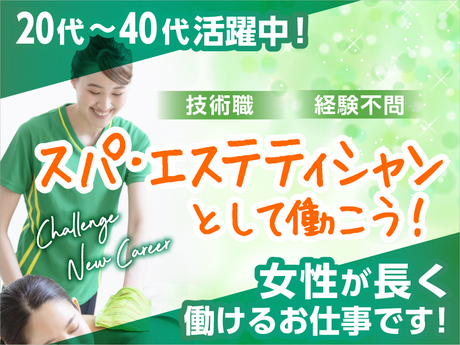 お仕事内容 ◆スパ・エステサロンでの施術・接客を担当していただきます。 具体的には… ◇予約受付/ご案内 ◇カウンセリング ◇ご要望に応じた施術 ・スクラブ(アカスリ) ・アロマリンパトリートメント ・海藻ジェルトリートメント ・フェイストリートメント ・顔ピーリング ・顔パック ・ヘッドリフレ ・デコルテリンパ *未経験の方でも安心の研修制度* 業界屈指の研修専門施設で、『結果の出せる技術』を丁寧にレクチャーします。 験者の方はこれまでのスキルを更に磨くことができるため、スキルの幅が広がります! 経験豊富な講師陣が、熱意を持ってイチから全て伝授します!