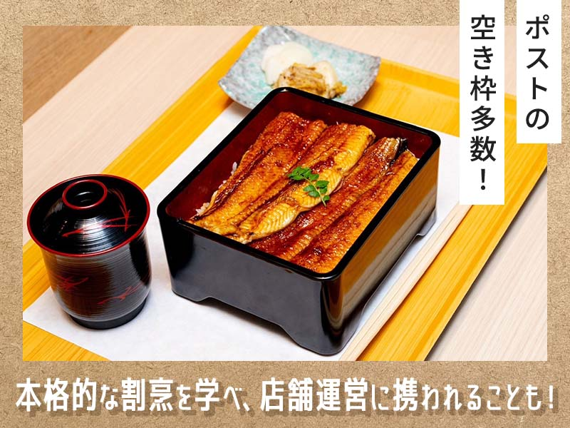 求めている人材 ◇◆日替わりの絶品まかないあり!◆◇ ……………………………………………… 当店こだわりのまかないを無料で食べれます! その日に仕入れた魚や丼ものや、 日によってはウナギが出ることもあるのでスタッフからも大好評♪ 節約にもなっちゃいますよ! ◇◆未経験でも高収入を目指せる!?◆◇ ……………………………………………… 料理未経験でも年収1,000万円を目指せる♪ 業態全体でうなぎ開ける人口が少ないため、うなぎを開けるだけでも高収入を狙えます! 手に職としては困らない為 将来的に起業したいという方にもピッタリです◎ 経営のノウハウもしっかりと伝授! ==================== ▼こんな方にオススメ▼ ・落ち着いたところで働きたい ・人と話すのが好き ・接客や調理経験を活かしたい ・駅チカで働きたい ・美味しいまかないが食べたい ・髪色・髪型自由なところで働きたい ・努力がしっかりと給与に反映! ・お休みはしっかり休みたい ・成長企業で働きたい ・今すぐ働きたい ・飲食業界経験者 ・いつか起業したい ・久々に仕事復帰したい -=================== ※お気軽にお問い合わせください♪