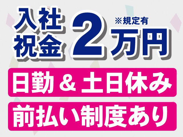 【保険制度】 雇用保険、労災保険、健康保険、厚生年金 待遇 ・入社祝金2万円※当社規定による ・給料前払い制度あり(毎月15日25日、5万円ずつ、計10万円まで) ・社会保険完備(雇用、労災、健康、厚生) ・車通勤OK ・交通費支給あり(当社規定内) ・受動喫煙対策あり:禁煙