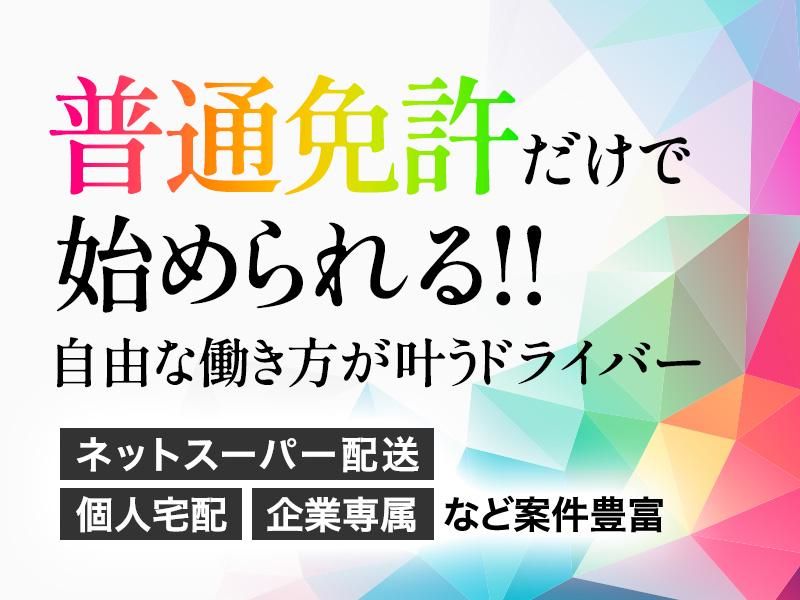 仕事内容 働き方や実現したい収入額など、あなたのご希望に合わせて、幅広い案件の中から様々な配送業務をお任せします。 ▼がっつり稼ぎたい方には… 個人宅配がおススメ! 依頼に従い、荷物を届け先まで運びます。配送した個数に伴い、報酬が変動します。 ▼安定収入派の方には… チャーター便がおススメ! 法人への配送がメイン。全国24時間、ダイレクトに荷物をお届けする配送です。 ▼+αの収入UPを叶えたい方には… スポット便がおススメ! 急な配送や繁忙期のフォロー配送などが中心。1件あたりの単価が高く、半日単位から担当することができます。 ▼適度に休みを入れたい方は… ネットスーパー配送がおススメ! オンライン上で注文された商品を、スーパーからお客様の自宅へお届けします。固定のお客様からの依頼が多いため、ある程度こなしたら次第に慣れたルートで配送することができます。 ※その他、緊急配送、チルド・クール便、引越便、企業専属、倉庫保管、ルート便など、案件多数!詳細は面接にてお伝えいたします◎ ******************************** \お仕事スタートのサポート体制も万全です!/ ▼開業前のサポート 〈1〉研修制度あり! 先輩ドライバーの車に同乗して、仕事の流れや端末の操作方法などをイチから身に付けることができます。経験者の方は、研修なしで契約後に即稼働することも可能です。 ※本社から遠方地域で開業をご希望の方は、全国の協力会社にて同条研修を受けることが可能です。 〈2〉保険加入などの各種手続きをサポート! 自動車の任意保険加入など、事務的な手続きに関することもお手伝いします。 ▼開業後のサポート 〈1〉車両レンタルあり! 豊富なレンタル車の中から、月8,800円で配送車をレンタルすることができます。また車両の整備工場も完備!自家用車をお持ちでなくても、お仕事スタートできます♪ ※売上相殺可能 〈2〉ガソリンカード、ETCカード貸与 初期費用0円で始められるカギはココに!立て替えや経費精算の負担が軽減できます◎ドライバー経験者の方ならば、この待遇の良さが分かるはず! 〈3〉営業活動は一切不要 40~50社とのお取引があり、案件はかなり潤沢。ご希望の働き方に合わせて、本部から案件を紹介させていただきます◎全国に案件があるため、「地元で働きたい」という方のご要望にもお応えできると思います! 〈4〉日頃からの手厚いサポートあり 分からないこと、困ったことがあったら、いつでも気兼ねなくご相談ください!本社や協力会社がしっかりとサポートいたします◎ \普免があれば始められる!/ 業務委託のドライバーとして、 新たなスタートを切ってみませんか? ‥‥‥‥‥‥‥‥‥‥‥‥‥‥‥‥‥ ●案件潤沢!40社以上と取引あり ○稼働時間・休日・配送量など働き方は自分次第 ●頑張り次第で月50~60万円稼ぐことも可 ○1日単価3.5万円稼げる案件もあり ●月8,800円で車両レンタルあり ○初期費用0円!ガソリンカード/ETCカード貸与 ●自動車整備工場も併設! ○ご自身での営業活動は一切不要 ●全国募集!どこにいても働ける! ○開業に伴う手続き等のサポートあり! ●必要に応じて研修あり! ‥‥‥‥‥‥‥‥‥‥‥‥‥‥‥‥‥ ドライバー歴のある50~60代の方が中心に活躍中。もちろん、普免をお持ちであれば未経験スタートの方も大歓迎です! 「できるだけ働いて稼ぎたい」 「休みもしっかり取りながら安定収入を得たい」 「副業として午後だけ稼働したい」 …など、ぜひあなたのご希望をお聞かせください!