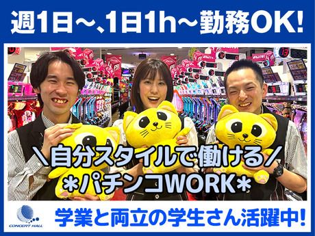 仕事内容 \ココがオススメ☆ポイント/ ・ー・ー・ー・ー・ー・ー・ー・ー・ー・ー・ー・ー・ー・ ☆週1日~・1日1時間~勤務OK! ☆土日のみ!平日のみ!短時間もOK ☆大学生歓迎OK! ☆学生生活との両立OK! ☆未経験・バイトデビューの方も歓迎! ☆最新設備多数で快適な職場環境 ☆重いドル箱運びや力仕事はナシ! ☆稼働分の前払いOK!(月2回まで) ☆交通費全額支給 ☆バイク・車通勤OK! ・ー・ー・ー・ー・ー・ー・ー・ー・ー・ー・ー・ー・ー・ 10代・20代の男女大学生さん活躍中! ・ー・ー・ー・ー・ー・ー・ー・ー・ー・ー・ー・ー・ー・ \ホール・カウンターで接客のオシゴト/ ・ー・ー・ー・ー・ー・ー・ー・ー・ー・ー・ー・ー・ー・ ☆ホールでお客様のご案内、接客業務 ☆カウンターでの景品交換のお手伝い ☆店内清掃 ・ー・ー・ー・ー・ー・ー・ー・ー・ー・ー・ー・ー・ー・ ●お客様が快適に楽しく過ごせるよう、 笑顔でサポートをお願いします! ●パチンコ経験がなくても安心♪ スタッフの多くが未経験スタートです! ●最新の空調完備で年中快適に過ごせます! ●パチンコ各台計数機導入で出玉を管理! 重いドル箱運びは一切ありません! ●休憩室にはテレビ・電子レンジ完備! お弁当派にも好評です♪ ・ー・ー・ー・ー・ー・ー・ー・ー・ー・ー・ー・ー・ー・ \こんな方を大歓迎!/ ・ー・ー・ー・ー・ー・ー・ー・ー・ー・ー・ー・ー・ー・ ●短時間で効率よく働きたい! ●授業やサークル活動の合間に 気軽にお小遣い稼ぎしたい ●ライフスタイルにあわせて働きたい ●知識・経験ゼロからはじめたい! ●パチンコ&スロットは全くの未経験 ●人と話すこと、接客が好きだ! ・ー・ー・ー・ー・ー・ー・ー・ー・ー・ー・ー・ー・ー・ ●男女学生さん歓迎 ●扶養内勤務OK ●WワークOK ・ー・ー・ー・ー・ー・ー・ー・ー・ー・ー・ー・ー・ー・ \スタッフさんの声/ ・ー・ー・ー・ー・ー・ー・ー・ー・ー・ー・ー・ー・ー・ 大学入学後、高時給バイトを探していて、コ ンサートホールに応募しました!大学に慣れ るまでは少なめのシフトで働いて、学業と無 理のない両立を目指しました。テストや帰省 時はシフトの調整もできて、自分の生活スタ イルにバイト時間を合わせられるから、スト レスもなく快適です! (10代大学生) ・ー・ー・ー・ー・ー・ー・ー・ー・ー・ー・ー・ー・ー・ 就活のスキマ時間に働いて、卒業旅行の資金 稼ぎをしたいと思い、高時給のコチラで働こ うと決めました。パチンコバイトは初めてで したが、難しいこともなく、学業との両立も ラクラク!内定をもらったら、時間を増やし て収入アップを目指して働きました!リッチ な卒業旅行が実現できて最高でした♪ (20代大学生) ・ー・ー・ー・ー・ー・ー・ー・ー・ー・ー・ー・ー・ー・ \コンサートホールは15店舗展開/ ・ー・ー・ー・ー・ー・ー・ー・ー・ー・ー・ー・ー・ー・ 私たち株式会社コンチェルトは、クレディセ ゾングループ企業という安定した経営基盤の 元で、アミューズメント事業、不動産賃貸業 など多角的に事業を展開しています。 ・ー・ー・ー・ー・ー・ー・ー・ー・ー・ー・ー・ー・ー・ パチンコ&スロット店「コンサートホール」は 東日本を中心に現在15店舗展開! どの店舗もパチンコ&スロットを楽しむお客 様はもちろん、働くスタッフにとっても、居 心地の良い快適空間を目指した店舗づくりに 日々、取り組んでいます! ・ー・ー・ー・ー・ー・ー・ー・ー・ー・ー・ー・ー・ー・
