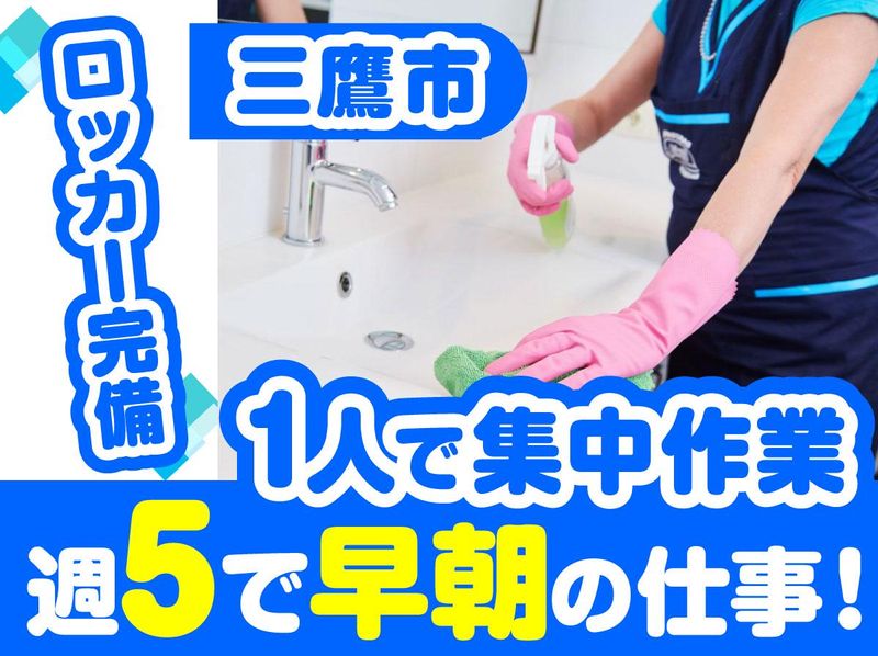 仕事内容 \早朝・夕方×短時間!一人でサクッと働ける♪/ 三鷹市にある公共施設スポーツセンターでの 共用部の日常清掃をお任せします! 【具体的には…】 ◆事務室や廊下などの掃除機掛け ◆各フロアのごみ回収 ◆女子トイレや更衣室、シャワー室の 水回り清掃など ご家庭で行う清掃の延長のようなお仕事! 難しい業務は一切ないので、慣れてきたら 自分のペースでモクモクと働けます♪ .+*・*☆・.+*+――――――――――――― 【応募方法】 <ネットの場合> ・「応募画面へ進む」をクリック ・必須項目を入力(名前、電話番号、 メールアドレス、生年月日) ・応募完了! <電話の場合> 下記の番号までご応募ください。 「求人を見た」とお伝えいただくと スムーズに対応できます。 TEL:03-5330-8831(採用担当)