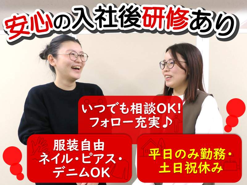 求めている人材 未経験歓迎! ブランクがある方もフォロー致しますので是非ご応募下さい◎ ✅必須条件 ■簡単なPC入力ができる方 (Excelのコピー&ペースト、文字入力など 基本的な操作ができれば大丈夫です) ■ファイルの保存、開く、フォルダ作成など、 基本的なファイル管理ができる方 ✅こんな方をお待ちしています! ■子育てがひと段落して復帰したい方 ■都心への通勤に疲れてしまった方 ■主婦(夫)の方、子育てと両立したい方 ■コツコツ・正確な作業が得意な方 ■接客業など異業種から事務職へ転身したい方 ■長く安定して働きたい方 ■30代・40代・50代の女性活躍中 ✅異業種からの転職も多数 元アパレル販売、飲食店スタッフ、美容師、 保育士、介護士、ホテルスタッフ、営業職など、 事務未経験スタートの先輩が多数! また、アルバイト・パートのみの主婦パートさんも 当社に入社して活躍しています! 「座って落ち着いて仕事がしたい」 「土日祝はしっかり休みたい」 そんな理由での転職者が活躍中です。 ✅実際に働くスタッフの声 ━━━━━━━ 「週4勤務のおかげで、子どもの学校行事や 親の通院付き添いも無理なくこなせます」 「以前は都心まで往復2時間以上。 今は自転車通勤で、夕方の時間が たっぷりとれるようになりました」 「9割以上が女性の職場ですが、 サバサバした関係でとても働きやすい!」 「10年以上のブランクがあり、 久しぶりのPC業務で不安でしたが、 マニュアルを見ながら 自分のペースで覚えられました」