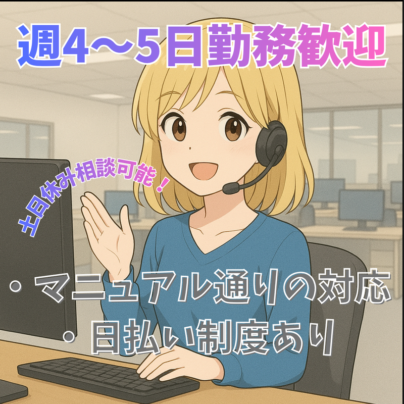 仕事内容 - この求人のポイント! ✅長期で働きたい方歓迎!! ✅オープニング!人気につきお早めにご応募を ✅オフィスワークデビュー歓迎! ✅髪型&服装自由♪おしゃれも楽しめます! - \\映画好き必見!// お客さまが見たい映画を上映している映画館やお時間を お電話でお答えするだけのシンプルなお仕事です(^^) 困った時の質問集やマニュアルもしっかりあります♪ しゃべる内容も台本があるので未経験でも安心して始められますよ♪ ◆未経験でも始められるオフィスワーク◆ PCの文字入力が出来ればOK! FAQやマニュアル完備! お電話での対応も台本通りのご案内でOK! 万全のサポート体制で、先輩スタッフがフォローしてれるので安心です◎ ◆働きやすい環境をご用意!◆ シフトは希望に沿って対応可能なので、 自分の生活スタイルに合わせて働けます。 働く場所は街中の駅チカオフィス! 暑い日や雨の日も快適に通勤出来ます♪ 街中のオフィス&残業なしなので、 仕事後にショッピングや友達とのごはんなど プライベートもしっかりと両立可能! オフィスも綺麗でカフェのような休憩室も完備! コンセントやWi-Fi、冷蔵庫や電子レンジも完備しているので しっかりとリフレッシュ出来ます♪ <スタッフの声/30代女性> 最初は電話で話すことに不安がありましたが、 研修で基本的な言葉遣いや応対の仕方をしっかり教えてもらえたので 安心して業務に入ることができました。 お客様の「ありがとう」という言葉が本当に励みになります。 今では自分に自信が持てるようになりました!
