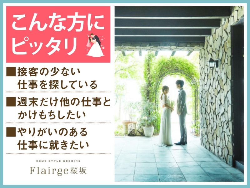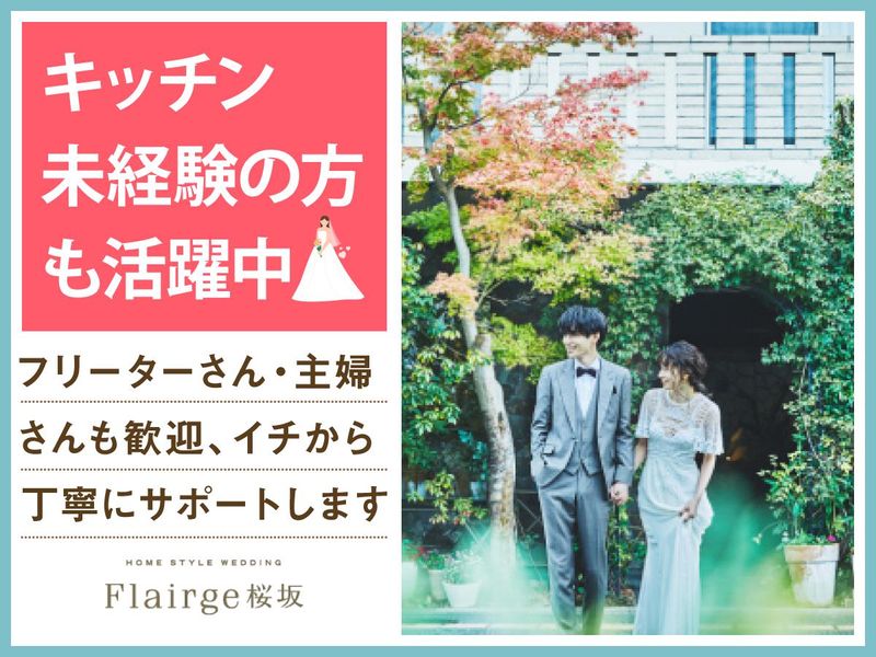 仕事内容 *一軒家貸切のホームスタイルブライダル会場* 感動いっぱいの結婚式を一緒にサポート♪ 週1~の柔軟シフトでWワーク・副業OK! フリーター・学生・主婦パートも活躍中♪ フレアージュ桜坂は 4階建ての一軒家を貸し切った ホームスタイルの結婚式場。 ウェディングのお手伝いをするお仕事です◎ <主なお仕事内容は…> ■洗い場での洗い物作業 ■仕込みの手伝い ■オープン準備 ■備品・お皿の準備 ■簡単な調理と盛り付け など お客様に提供する料理の 簡単な調理と盛り付けをお任せ◎ 心を込めて調理をしテーブルが華やぐように綺麗に盛り付けます♪ 未経験でも先輩が丁寧にお教えするので安心!一流シェフの技を学べるチャンス! ―――――――――――――――― フリーター・パート主婦・学生さん オススメのポイントはこちら★★ ―――――――――――――――― ・週1日~1日4時間~OKで融通◎ ・本業が休みの土日だけ等大歓迎! ・かけもち・副業OK! ・絶品のまかないアリ(^^) まかないは本格料理人たちが 美味しい食材を使って作ってくれます♪♪ 現在アルバイト・パートは10名! 学生アルバイトが多数活躍中! フリーターも在籍しています! (男女比:男性2:女性8) 社員は会場全体で15名が在籍中! ブライダル=女性と思われがちですが、 性別問わず活躍できます! 男女ともに活躍中です! ―――――――――――――――――― こんな方にピッタリです! ―――――――――――――――――― ■モクモクと作業するのが好きな方 ■裏方の仕事に興味がある方 ■接客は少なめがいい方 ■ブライダルやレストランに興味がある方 洋菓子店、レストラン、ホテル、結婚式場、カフェなど、 経験がある方は活かしていただけます★ もちろん未経験でもOK! ―――――――――――――――― 未経験者歓迎! みんなで助け合う雰囲気です ―――――――――――――――― 「働くこと自体久しぶり…」 そんな方もご安心ください。 不安がなくなるまで、 スタッフ全員でサポートします◎