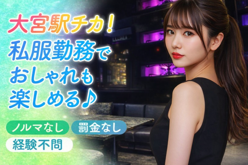 仕事内容 ✅未経験さん大歓迎! まだまだ募集中♪ 大宮の繁華街から 少し外れたところにあるラウンジで、 キャストとして一緒に働きませんか? 「春から新しいことを始めたい」 「新生活に向けて、ムリなく働けるお店を探している」 そんな方にぴったりのお店です♪ お任せするのは、 お客様にドリンクをお作りしたり、 楽しく会話を楽しむシンプルなお仕事♪ 私服OKだから、気取らず、 あなたらしく働けます◎ 営業ノルマや客引き・ ビラ配りなどの外業務は一切ナシ! プレッシャーなく、店内での接客だけに 集中できるから安心です♪ お店はカウンター5席・ テーブル3卓のこぢんまりとした空間。 1対1のマンツーマン接客ではなく、 みんなでワイワイ盛り上がるスタイルです♪ 「話題に困ったらどうしよう…」 そんな時は、周りのスタッフが すぐにフォローに入るから心配不要! 未経験スタートの方でも、笑顔で 楽しく働けるよう全力でサポートします♪ ⏩ノルマ・罰金なし♪ 安心して働ける環境です! Wワークも大歓迎! 昼のお仕事や学業との両立をもサポート♪ 「プライベートが終わった後に、ちょっと働きたい」 そんな方にもぴったりの環境です。 ノルマやペナルティもなく、 無理なく自分のペースで働けますよ◎ ⏩お酒が飲めなくても大丈夫! 安心して始められます! 「お酒が苦手…」「全然飲めない…」 そんな方もご安心ください♪ ノンアルコールやソフトドリンクを ご用意しているので、 自分のペースで無理なく働けます! 朝に予定がある方や、 午前中に授業がある学生さんも、 ノンアルで安心して乾杯できますよ◎ また、お酒の作り方が分からなくても大丈夫! 水割りなどの基本から、丁寧にお教えします♪ 「会話がちょっと不安…」 という方もしっかりフォローするので、 未経験でも安心してスタートできます☆ ⏩待遇バッチリ♪手当も私服も 自由な働きやすいお店! 高時給に加えて、各種バックやボーナスなどの 手当もとっても充実! 短時間の勤務でもしっかり稼げて、 頑張り次第では時給以上の手当がつくことも◎ さらにノルマや待機カットは一切ナシ! お客様を待っている間もしっかり時給が発生するので、 プレッシャーなく自分のペースで働けます♪ ジーンズ以外なら普段着のままでOKだから、 学校やお仕事帰りにもそのまま出勤できちゃいます♪ 毎日の気分に合わせておしゃれを楽しみながら、 あなたらしくリラックスして働けます! ⏩送りありで安心の帰宅サポート! 終電を気にしたり、始発を待つ必要はありません♪ お仕事が終わったあとは、 専属ドライバーがご自宅までしっかりお送りします! お店の近くに駐車場を借りる手間もなし◎ 深夜の帰宅もラクラク&安心です♪