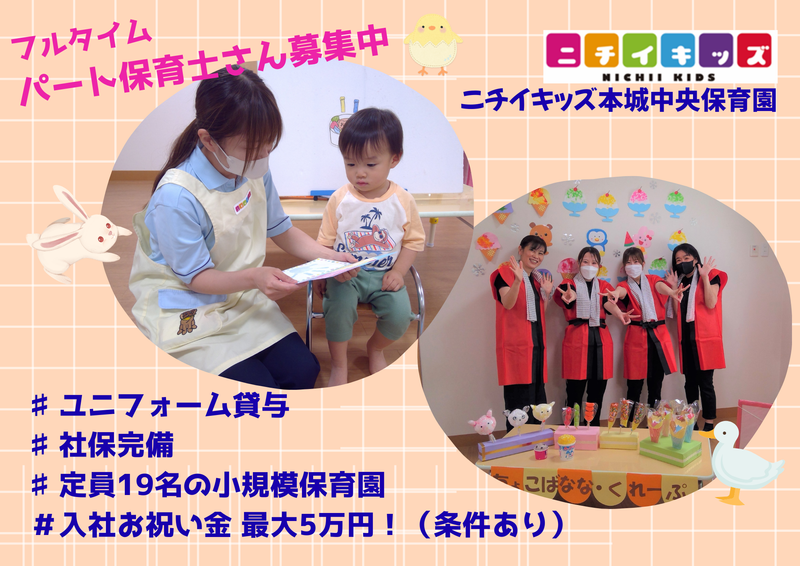 【Point オススメポイント】 ☆子どもとじっくり関わる小規模園 ☆もし残業あっても100%手当て支給♪ ☆OJT制度で初めて&ブランクの方にも丁寧に指導します ★見学も可能です★ お気軽にお問い合わせください 【Message 採用担当者より】 ☆保育園からのメッセージ☆ 0歳~2歳までのお子様を対象とした定員19名の北九州市認可の小規模保育園です。 少人数なので、子どもたち一人ひとりとゆっくりかかわることができ、 保護者の方と子どもの成長を共に喜び合える、とてもアットホームなところが 魅力の保育園です。 ぜひ一度、見学にお越しください!! 【お問合せ・園見学のお申し込み】 ニチイキッズ本城中央保育園 TEL: 093-693-4811 【新型コロナウイルス対策について】 面接および保育園見学の実施に際しては、マスク の着用、換気、消毒など感染症予防に努めており ますので、安心してお越しください。