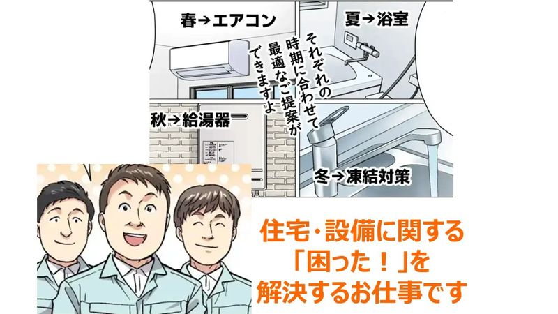 アピールポイント: ■この仕事の魅力 ・お客様から直接「ありがとう」がもらえる仕事 ・自分の手で住まいが生まれ変わる達成感 ・工事完了後に喜びの声を聞けるやりがいあり ・技術が身につき、一生モノのスキルに ■こんな方におすすめ ・手に職をつけたい方 ・体を動かす仕事が好きな方 ・人と接することが好きな方 ・DIYやモノづくりに興味がある方 ■未経験でも安心 ・先輩スタッフがマンツーマンで指導 ・簡単な作業からスタート ・工具の使い方から丁寧に教えます ■応募メッセージ 「ただの作業員」ではなく、 お客様の理想の住まいを形にする仕事です。 工事が終わったあとにいただく 「お願いしてよかった」の一言が、 何よりのやりがいになります。 未経験からでもしっかり育てますので、 ぜひ一緒に成長していきましょう!