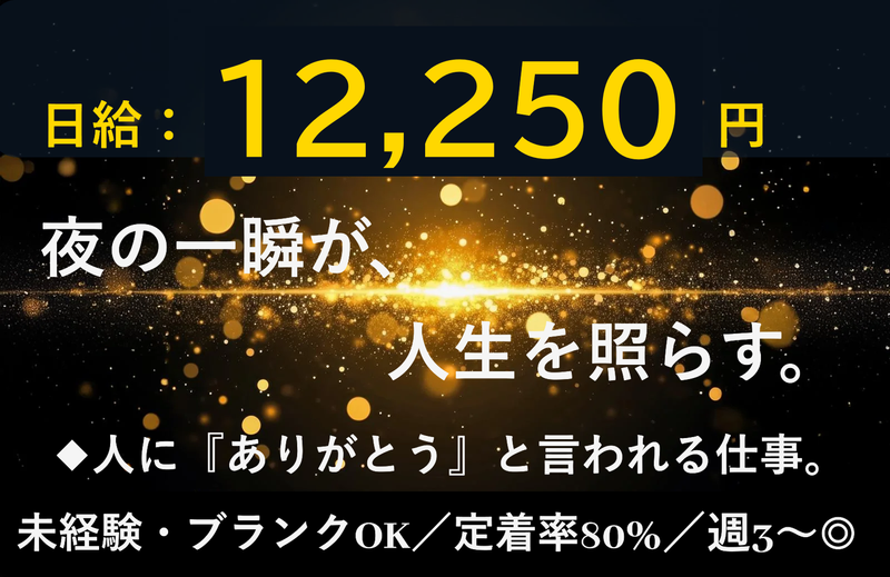日給12,250円以上 給与詳細 基本給:日給 1万2250円 〜 固定残業代:なし 【一律手当】 全員に一律で支払われる通勤・皆勤・家族手当金額:あり 全員に一律で支払われるその他手当金額:なし 【日給12,250円〜】 ※夜勤:10,250円 ※50勤務まで1勤務ごとに2,000円(入社祝い金)支給! ※残業があった場合は別途残業代支給 ※研修中も勤務開始後も、交通費は別途全額支給 ※研修中は新任研修4日間で34,400円+別途交通費となります。 【入社祝い金 10万円支給!!】 未経験者・経験者問わず、全ての方に入社祝い金あり! 2,000円×50勤務=10万円 【お給料日】 毎月、10日・20日・末日の月3回払いで安心! (月1回払い、週2回払いも可) ◆◇◆ 給与支払いについて ◆◇◆ ★月3回払いOK!★ 「10日・20日・月末」の3回払いだから、計画的に使える! ★ 手数料なし!条件なし! 受け取りたいタイミングでスムーズに対応可能 ★ 急な出費にも安心! 「今月ピンチかも…」そんなときに頼れる支払い制度 生活に合わせて柔軟に給与を受け取れるから、働きやすさ抜群! 【給与例】 給与例 ◎ 夜勤で月25日 勤務の場合 ガッツリ働きたい!でも自分の時間もちゃんと確保したい方にオススメ! 日給12,250円 × 25日 = 月収30万6250円 ◎ 夜勤で月20日 勤務の場合 ちょっとマイペースに働きたい方にオススメ♪ 日給12,250円 × 20日 = 月収24万5000円 ◎ 日勤での働き方もあります!/日給10,600円(※入社祝い金込み)