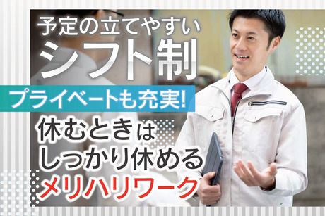 【月収35万円以上可】週5日働かない。出勤は月18日程度。それでも月収35万円以上!2交替×高時給1500円。働く時はガッツリ、休む時はしっかり。毎月3連休・4連休あり。