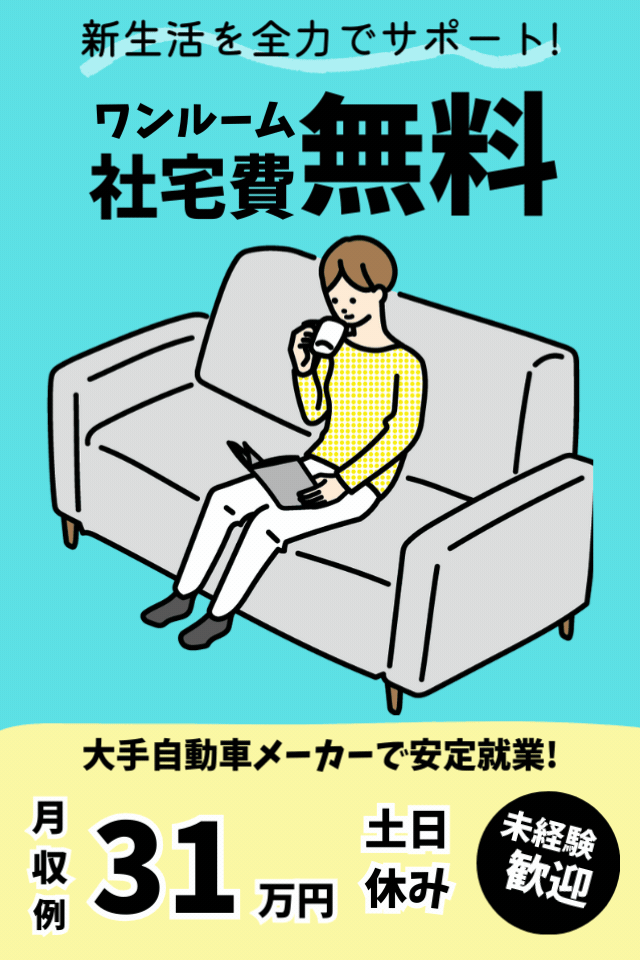 仕事内容 《 ここがポイント! 》 ●【ずっと寮費無料】家具家電付き1R寮完備! ●20代・30代男性スタッフが多数活躍中! ●月収31万円以上可の高収入ワーク ●無料送迎あり&ガソリン代補助あり ●土日休み×年間休日121日でプライベート充実! 《 主な業務 》 自動車用シートを製造する大手工場で、 組立・検査・フォークリフト業務をお任せします。 ▼具体的には… <組立> ・ライン上で車のシートへ部品を組み付け ・担当するのは数点のパーツのみで、 一度覚えればスムーズに作業可能! <検査> ・完成品の動作確認やカバーのしわチェックなど ・目視で丁寧に確認して品質を保ちます <フォークリフト(有資格者のみ)> ・製品パレットを運搬 ・手積み→運搬→先出し作業を担当 ★すべてマニュアル完備! 未経験でも安心してスタートできます。 《 職場環境 》 ・敷地内禁煙 ・無料送迎バスあり(寮⇔工場間) ・マイカー通勤OK ・工場内に社員食堂・休憩スペースあり ★家具家電付き1R寮完備! スーパー・飲食店・商業施設が近く、 生活に便利なエリアです。 ★無料送迎バスあり 渋滞や電車遅延の心配もナシ! 《 PRポイント 》 ★寮費がずっと無料! 月5万円相当のワンルーム寮が0円! 生活費を抑えて貯金も可能です。 ★未経験から高収入! 月31万円以上可&昇給・手当も充実。 安定した大手メーカー勤務で長期安心。 ★充実したフォロー体制! 担当者が毎日工場に常駐し、 勤務後のフォローも万全です。