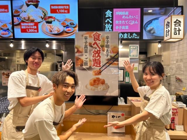 仕事情報 ● 仕事内容 ・レジでの対応業務 ・お客様のご案内、定食の提供 ・お皿の片付け、卓上備品の補充 などのお仕事です! 学業や子育てと両立できる柔軟なシフト体制で、 学生さんや主婦さんのみならず、 WワークOKなのでフリーターさんも活躍中! 未経験でも安心な研修体制も◎ まかない付き、髪色自由など待遇面も充実! やまやの働き方について 新人研修はもちろんのこと、 残業代・交通費はしっかり支給! 美味しいまかないやお得な従業員割引もあり、 働く楽しみが倍増♪ さらに、急なお休みにも柔軟に対応するので、 プライベートとの両立もバッチリ! スタッフが安心して働ける環境を整えています! やまや食堂について 県内人気施設フードコートの定食屋です。 メインのおかずはやまやの定番から 日替わりまで豊富な種類を取り揃えています。 もちろん沖縄やまやの辛子明太子、 からし高菜やごはんは食べ放題! 働く仲間について やまやは完全人柄採用! そのため、一緒に働く仲間は年齢・背景に関わらず やまやの同僚として助け合っています! 人間関係で悩んだことがある方や、 人とのコミュニケーションがちょっぴり苦手な方も ぜひ一度やまやにお越しください! 当社(やまや)について 当社は福岡県発祥の明太子メーカーです! 九州の美味しいものを全国の方々に知っていただくために ロングセラーの辛子明太子を筆頭に、 もつ鍋専門店「博多もつ鍋やまや」や 天ぷら専門店「博多天ぷらやまや」など 外食事業にも注力しており、全店舗が黒字経営! これからも九州の美味しさを全国へお届けします!